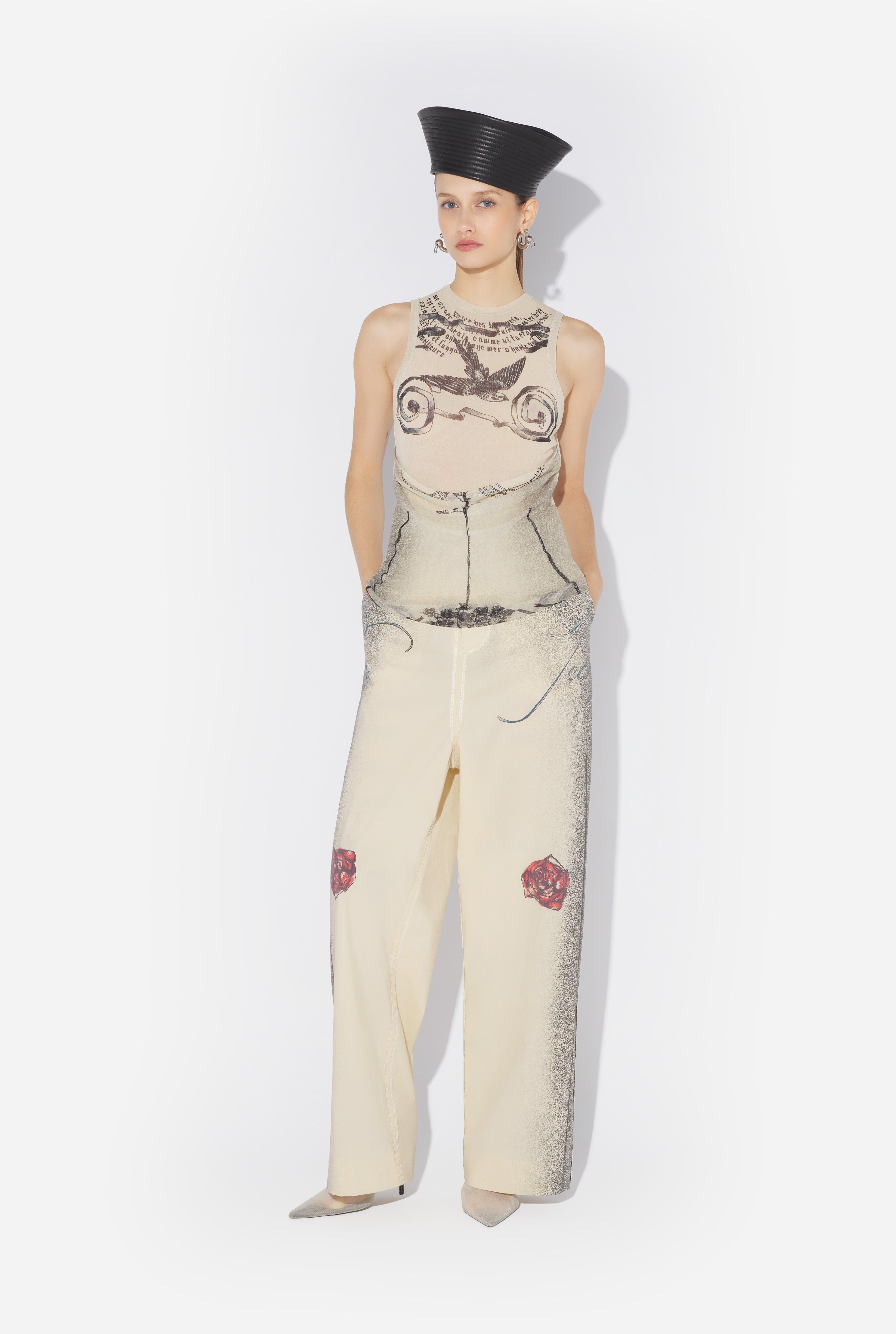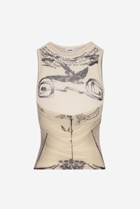 Ecru tulle tank top with “Tattoo Rose and Bird” print and draped tulle in front. PRODUCT DETAILS - Tight fit - Crew neck - Stretchy material - Material: 100% polyamide - Made in Italy - Reference: 25/34-F-DB054-T583-030030