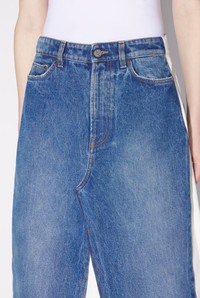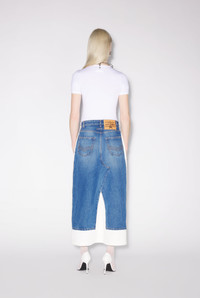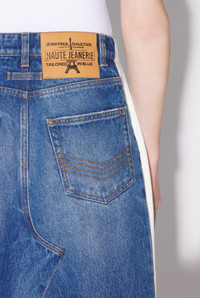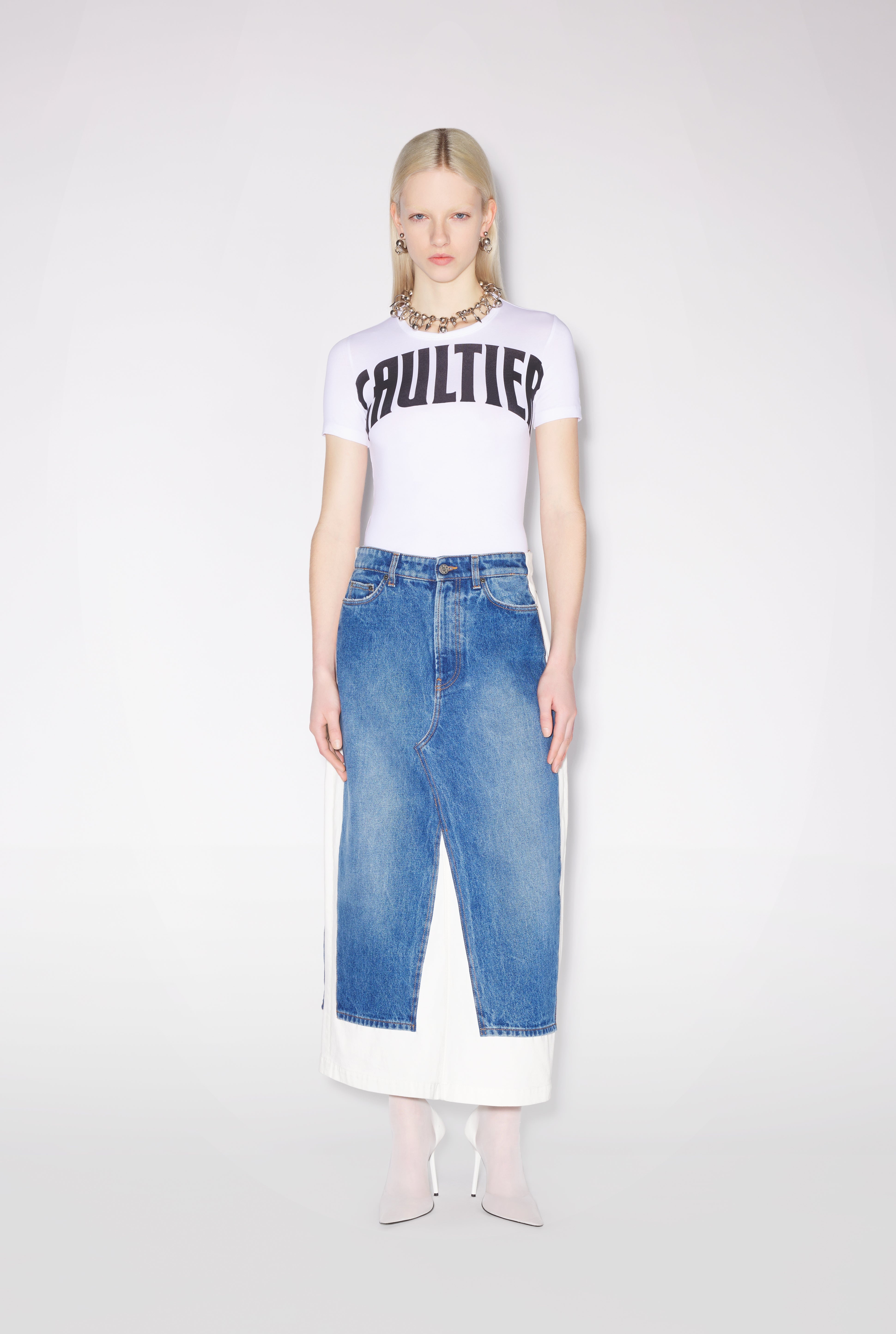 Très Gaultier Collection White denim skirt with blue denim trompe-l'œil appliqué. PRODUCT DETAILS - Straight fit - Five pockets - Belt loops - Engraved Jean Paul Gaultier metallic button fastening - Material: 100% Cotton - Made in Italy