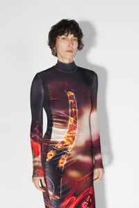 Fashion Fiction Collection Gathered red and black velvet dress with pigalle print. PRODUCT DETAILS - Tight fit - Turtleneck - Stretchy material - Long sleeves - Materials: 92% polyester, 8% elastane - Made in Portugal