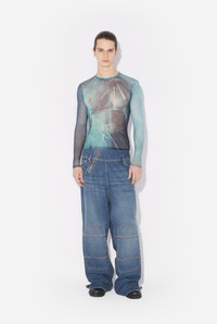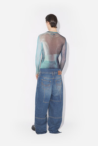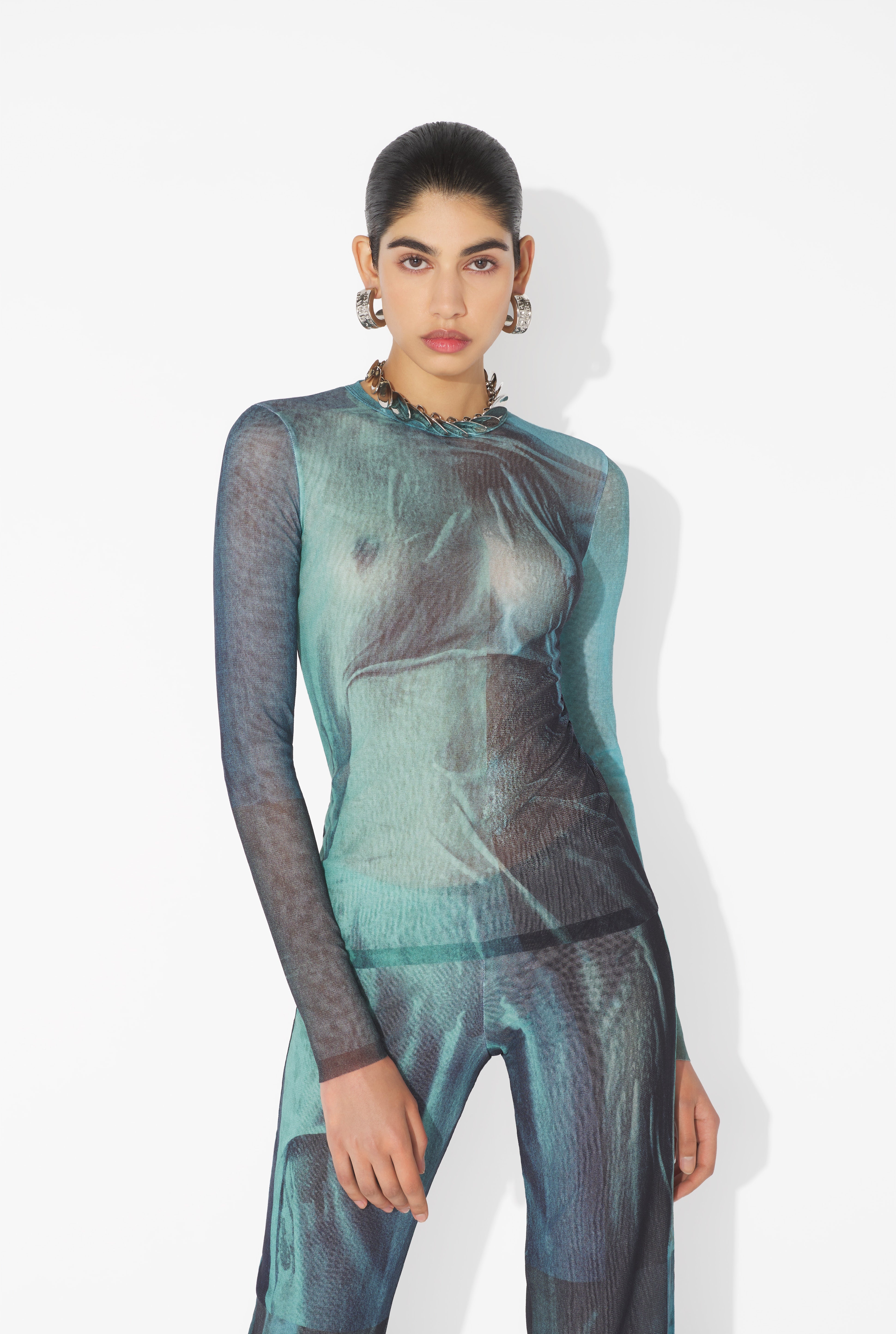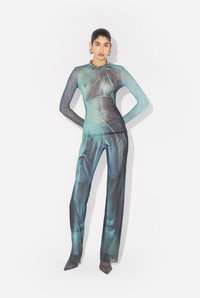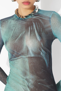 Long-sleeved blue tulle top with “Water” print. PRODUCT DETAILS - Tight fit - Crew neck - Stretchy material - Long sleeves - Tulle lining - Material: 100% polyamide - Made in Italy - Reference : 25/03-W-TO310-M004P-5557