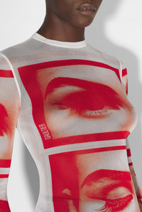 Fashion Fiction Collection White tulle top with red “eyes and lips” print. PRODUCT DETAILS - Tight fit - Crew neck - Stretchy material - Material: 100% polyamide - Made in Italy
