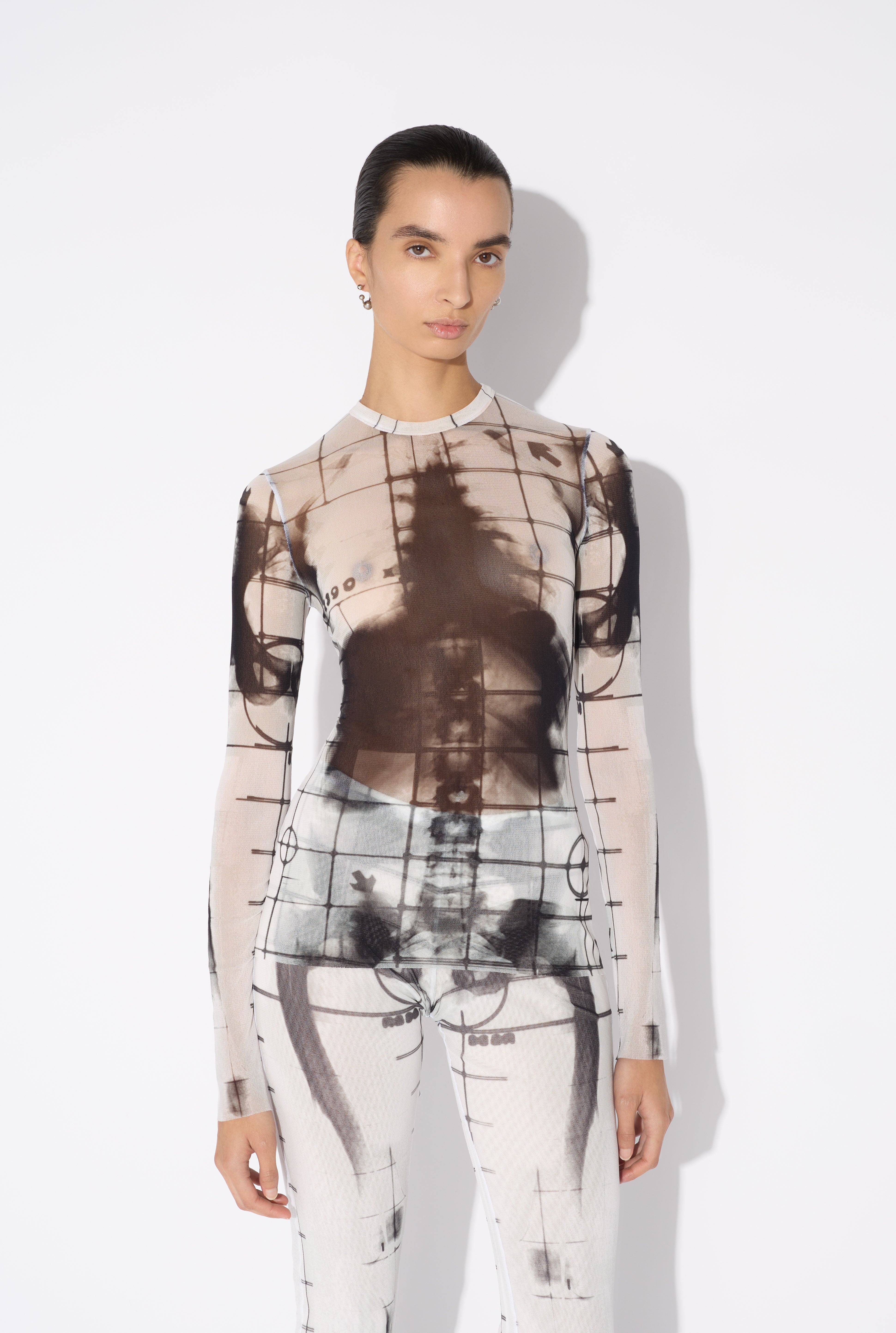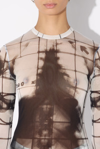 Long-sleeved white tulle top with “Squeletor” print. PRODUCT DETAILS - Tight fit - Crew neck - Stretchy material - Long sleeves - Material: 100% polyamide - Made in Italy - Reference: 25/33-F-TO241-T580-0100