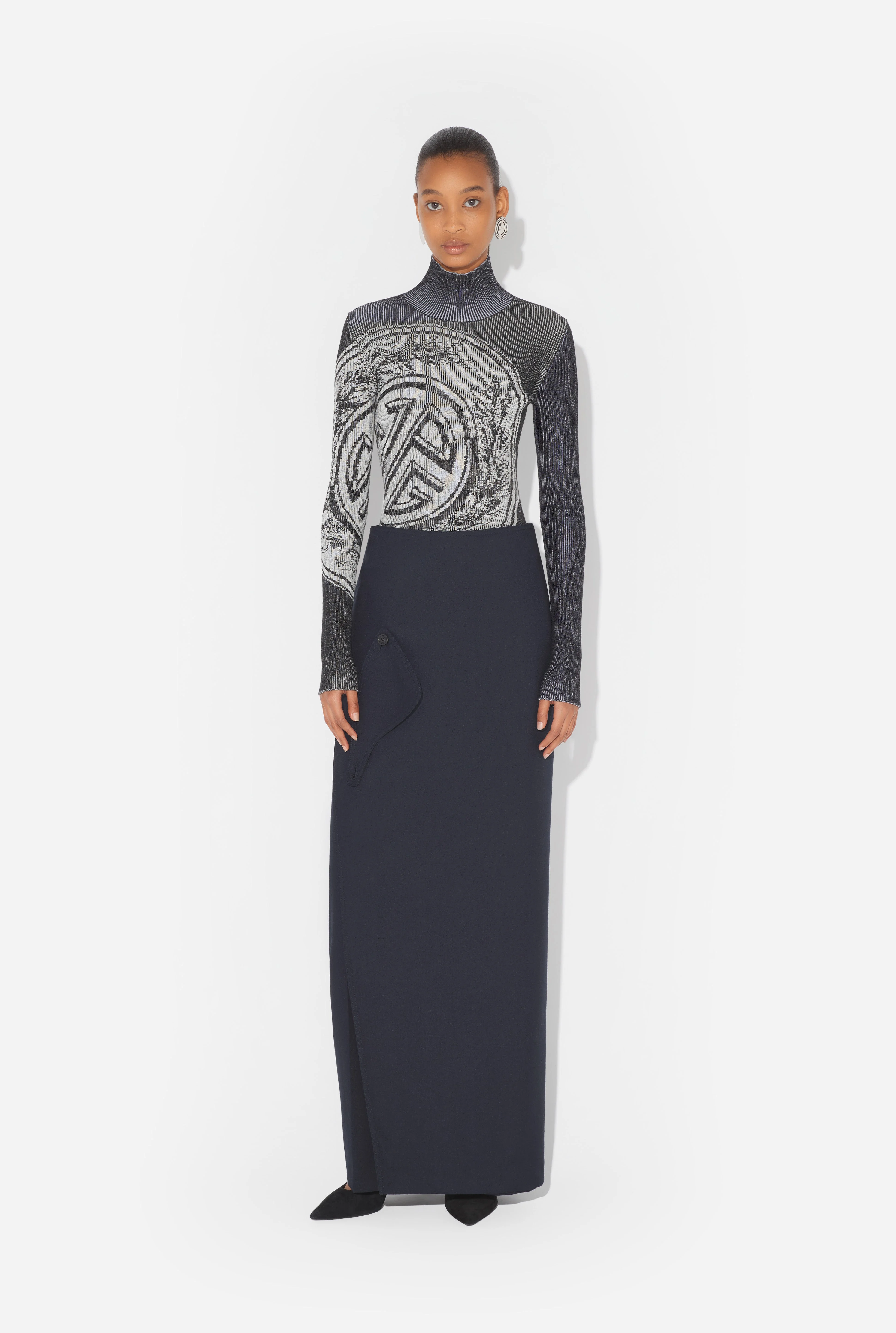 Navy wraparound pant skirt fastened with a trench collar panel. PRODUCT DETAILS - Straight fit - Low waist - One piped pocket on the back, right-hand side - Two engraved Jean Paul Gaultier horn buttons for the wraparound fastening - Trench collar details with button placket on right leg - Invisible zip fastening on right side - Materials: 77% polyester, 23% virgin wool - Made in Italy - 25/04-W-TR035-W040-59