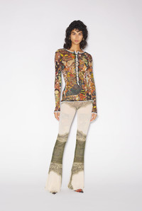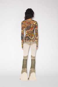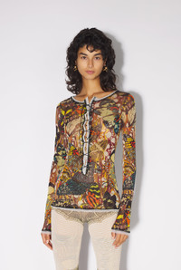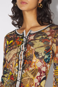 Très Gaultier Collection Long-sleeved tulle top with yellow butterfly print. PRODUCT DETAILS - Close-fitting cut - Stretch material - Crew neck - Embroidered finishes - Black polyester laces - Material: 100% Polyamide - Made in Italy