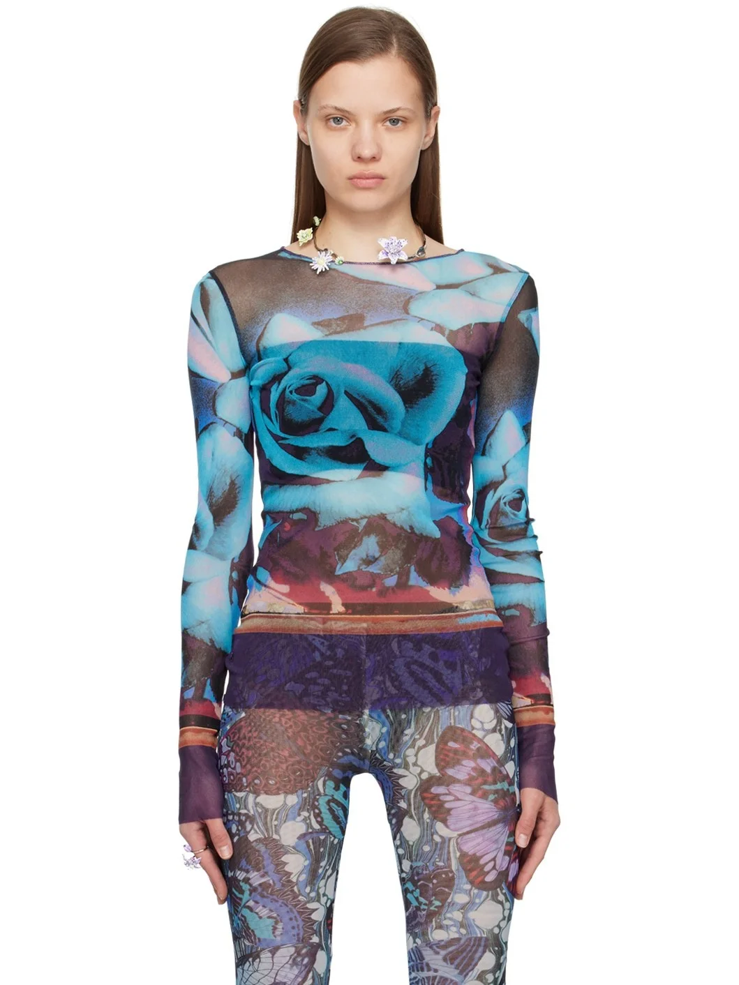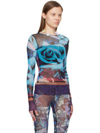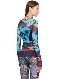 Sheer nylon mesh T-shirt. Graphic pattern printed throughout. · Crewneck · Raw edge at hem and cuffs · Locker loop at back collar Supplier color: Purple/Blue/Pale pink 100% polyamide. Made in Italy 242808F110007