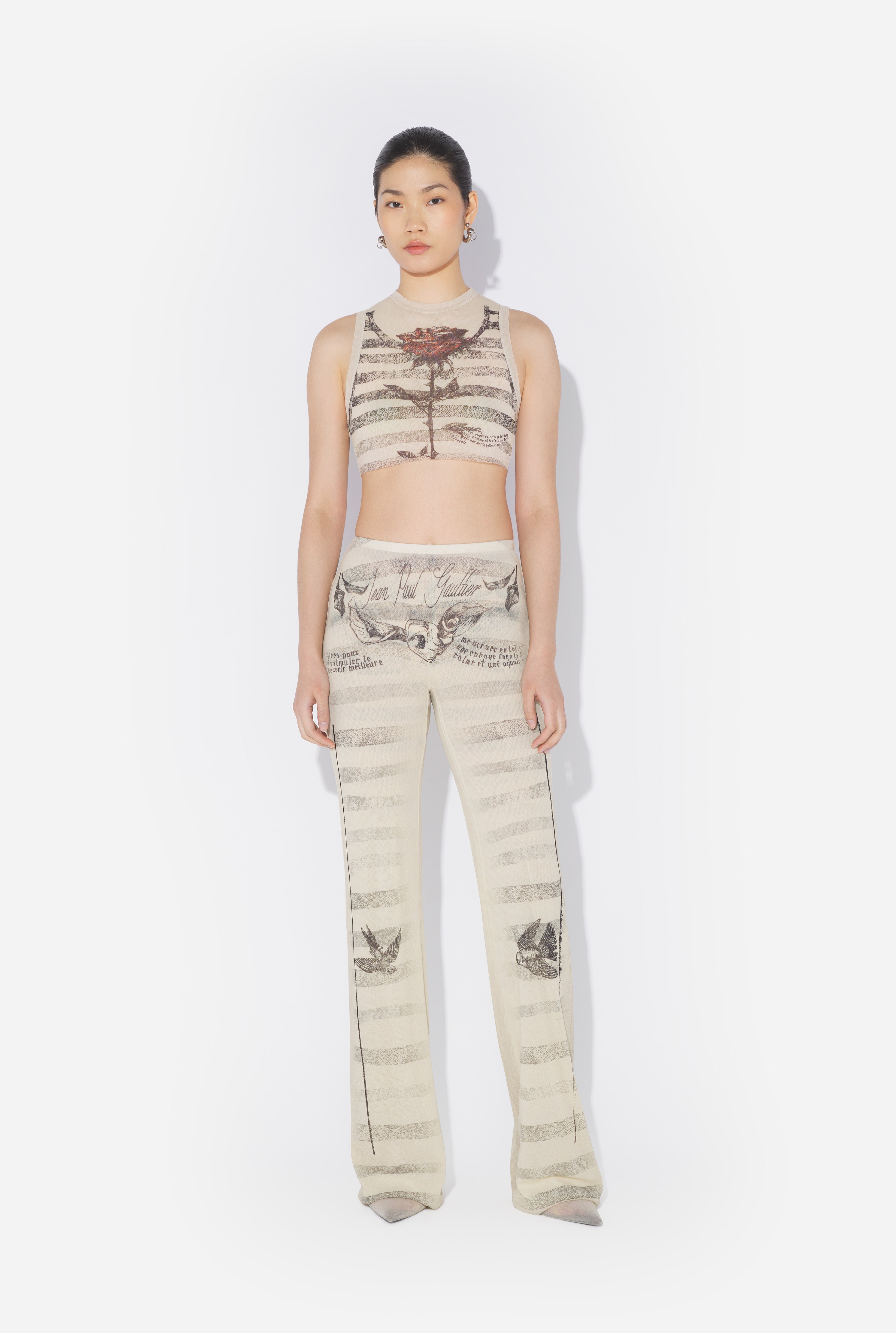 Ecru tulle pants with “Tattoo Mariniere” print. PRODUCT DETAILS - Straight fit - Stretchy material - Elastic waistband - Tulle lining - Main material: 100% polyamide - Secondary material: 100% polyamide - Made in Italy - Reference: 25/34-F-PA191-T586-030030