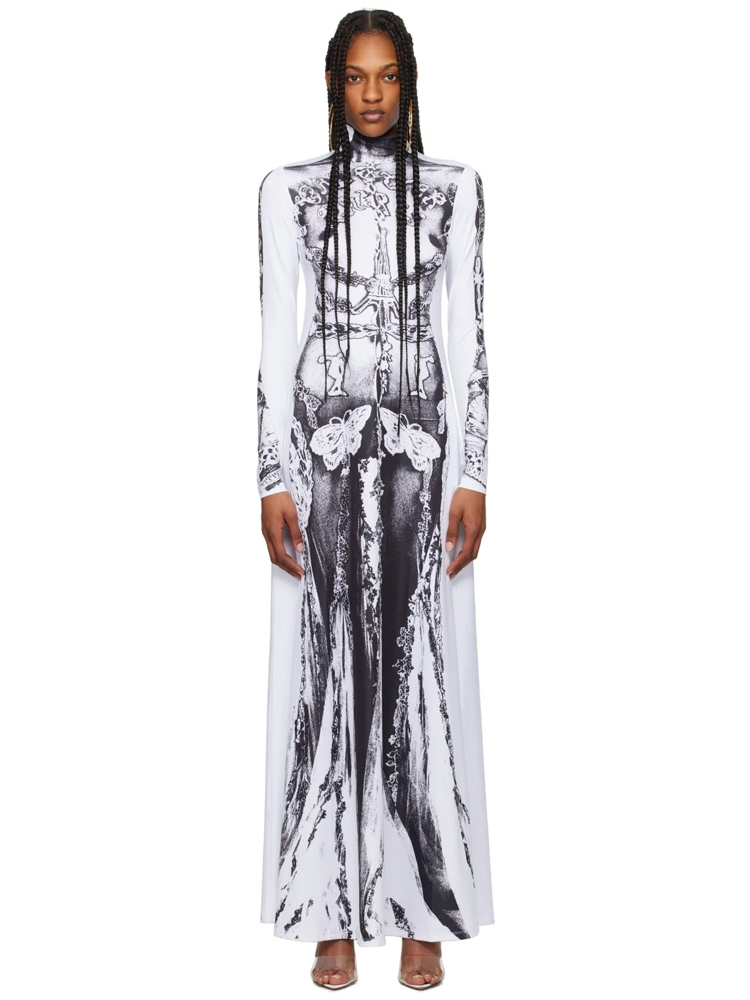 Stretch nylon jersey dress. Trompe l'œil graphic logo printed throughout. · Turtleneck · Flared hem · Locker loop at open back Part of the Tres Gaultier collection. Supplier color: White/Black 87% polyester, 13% elastane. Made in Portugal 242808F055010