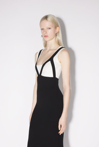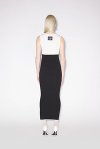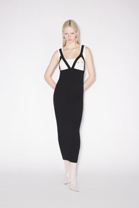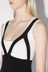 Tres Gaultier Collection Black knit dress with white cotton tank top detail. PRODUCT DETAILS - Slim fit - Haute Jeanerie jacquard label on the back - Materials: 70% Viscose, 30% Polyester - Made in Italy