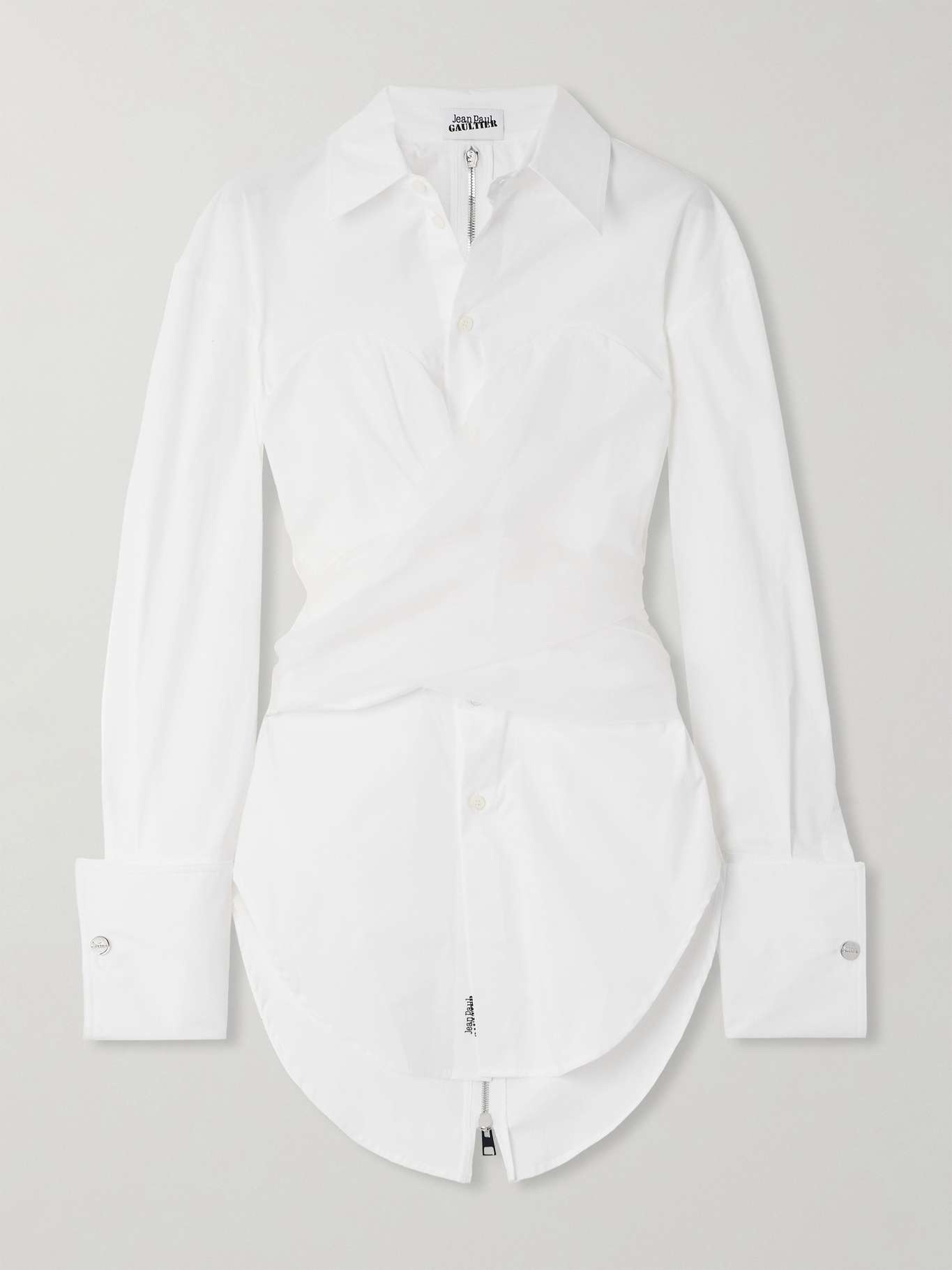 EDITORS'NOTES Jean Paul Gaultier re-imagines the classic collared shirt, overlaying this version with organza that's gathered and wrapped to create beautiful texture. It's made from cotton-blend poplin for a slim fit and has a dramatic curved hem and exaggerated cuffs. SIZE & FIT Model measurements: - Fits true to size, take your normal size - Designed for a slim fit - Slightly long in length - Lightweight, non-stretchy fabric - Model is 180cm/ 5'11" and is wearing a size Small - Bust: 85cm/ 33.5" - Waist: 62cm/ 24.5" - Hip: 88cm/ 34.5" DETAILS & CARE - White cotton-blend poplin and silk-organza - Two-way zip fastening along back - 97% cotton, 3% elastane; trim: 100% silk - Dry clean