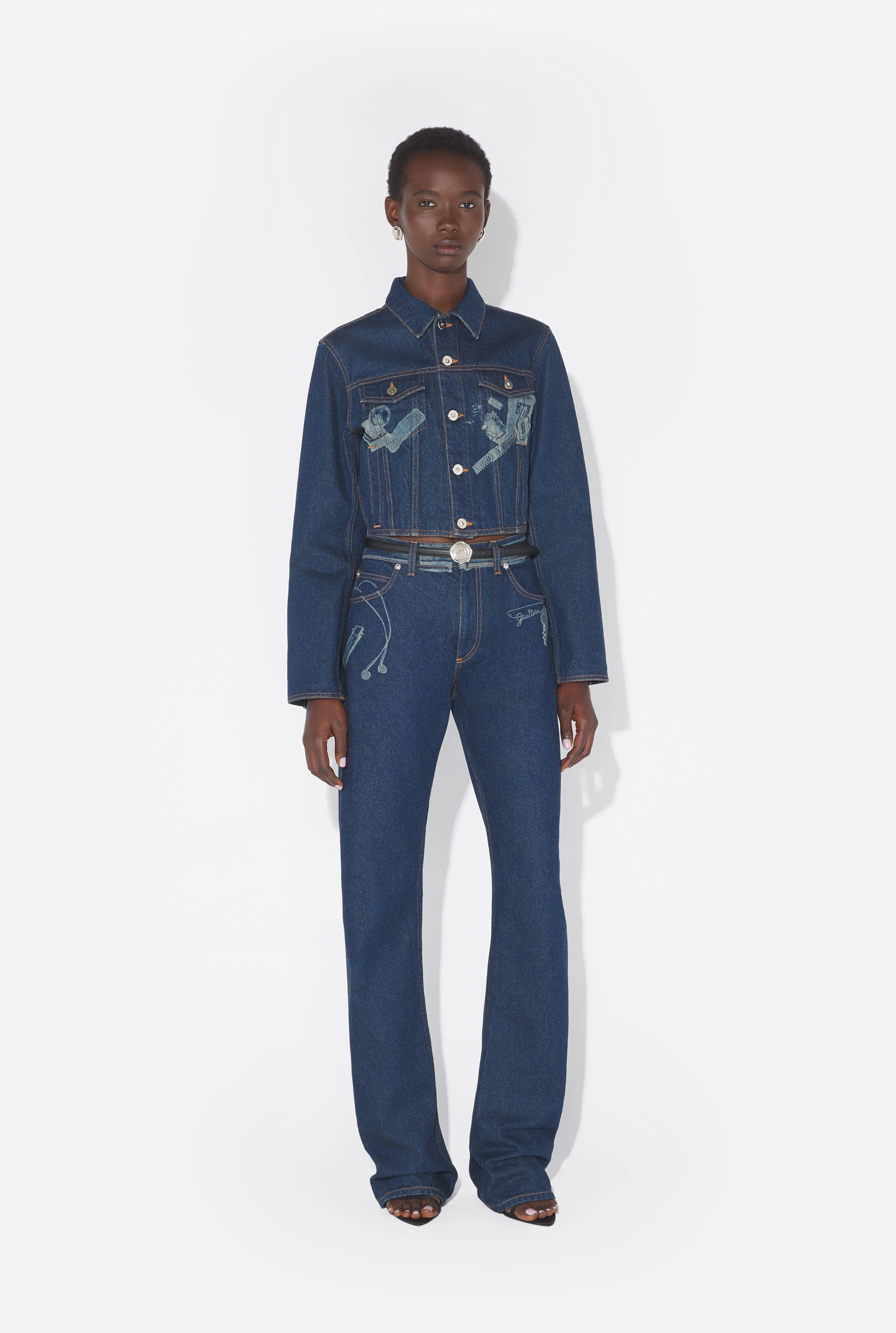 Blue denim jeans with various trompe l’œil details printed on front and back pockets. PRODUCT DETAILS - Straight fit - Contrasting topstitching - Five flat pockets - Belt loops - Buttons with Jean Paul Gaultier engraving - Rivets with Jean Paul Gaultier engraving - Material : 100% cotton - Made in Italy - Reference : 26/01-W-TR060-D027-57