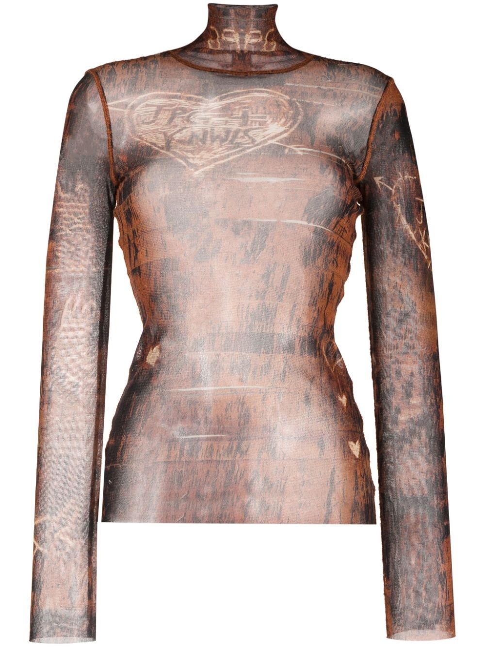 x KNWLS graphic-print sheer top Teaming up with KNWLS, Jean Paul Gaultier continues to create fitted designs that contour the figure while bringing colours through unique artworks. This mesh top is animated with a striking graphic print, featuring "JPG + KNWLS" lettering inside heart motifs. Highlights - Brown - Semi-sheer construction - All-over graphic print - High neck - Long sleeves - Straight hem Made in Italy Composition Polyamide 100% SIZE & FIT Model measurements Height 5 ft 10 in(1.78 m) Bust/Chest 32.67 in(83 cm) Hips 34.25 in(87 cm) Waist 24.4 in(62 cm) FittingInformation Designed for a close fit throughout Made from a lightweight non-stretch fabric, this piece offers minimal elasticity when worn This piece fits true to size – take your usual size
