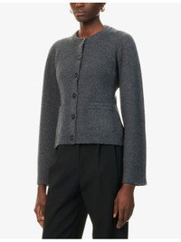 PRODUCT DETAILS - Jenni Kayne wool and cashmere cardigan - 70% wool, 30% cashmere - Exposed button fastening at front - Regular fit, round-neck, long sleeves, two welt pockets at front, cinched waist, ribbed trims - Dry clean - True to size - Size small: length 22in / 57cm - Model is 5ft 10in/1.78m and wears a size small - Midweight, stretchy Ref: R04529903