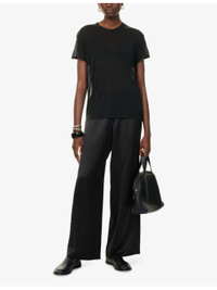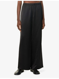 PRODUCT DETAILS - Jenni Kayne woven trousers - 58% rayon, 42% polyester - Relaxed fit, high-rise, wide leg, elasticated waistband, all-over satin texture - Dry clean - True to size - Size small: rise 13in / 34cm, inside leg 30in / 77cm, leg opening 24in / 61cm - Model is 5ft 10in/1.78m and wears a size small - Lightweight, stretchy Ref: R04529910