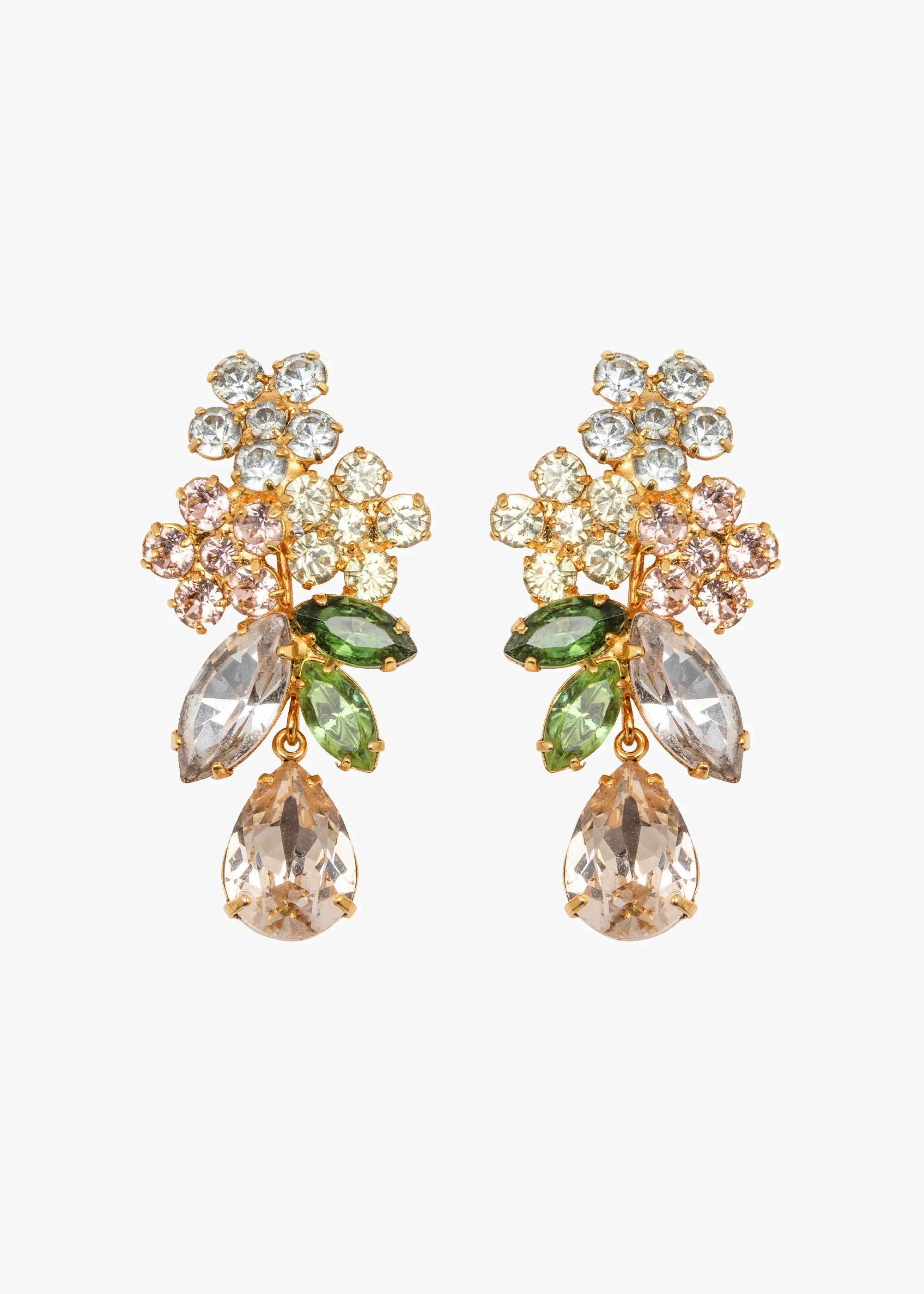 The aptly-named Bouquet Earrings are wearable floral arrangements, offering a welcome dose of irreverent glamour. Each bouquet is assembled of fine crystals in a variety of cuts and shapes, creating a spectacular feast for the eyes. Interesting yet compact, they are perfectly sized to incorporate into any look. Material The Bouquet Earrings are made by hand in New York from 18K gold plated brass and crystals. They have a surgical-steel post, are nickel-free, and safe for sensitive skin. We recommend storing earrings in their dust bag while not in use, and avoiding contact with water, perfume, hairspray, and other chemicals.