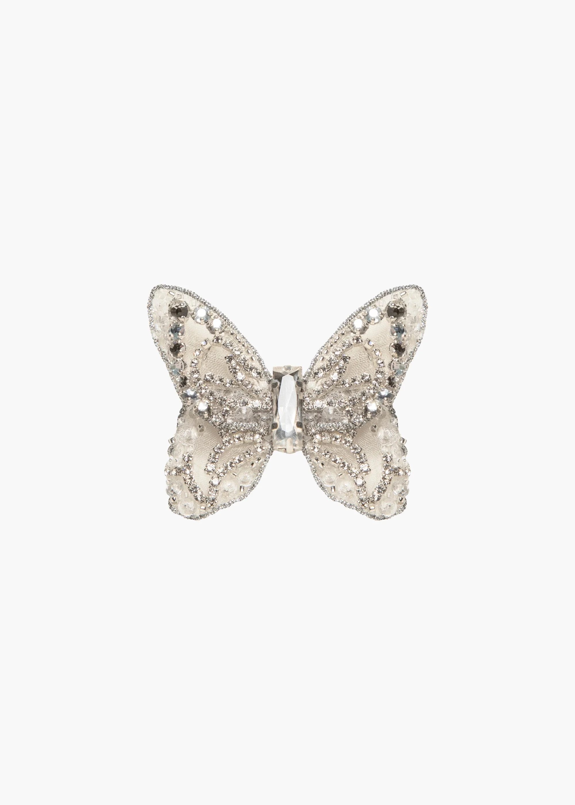 The Abbie Barrette is made by hand in New York, with hand-embroidered Austrian crystals scattered across silk chiffon, dip-dyed to create an ombre effect. The butterfly is wired by hand to create its nuanced, lifelike shape— butterflies are integral to the Jennifer Behr brand, representing spiritual rebirth and connection to the divine. Each one is finished with a French flip clip for secure placement anywhere in the hair— layer multiples at once for a dramatic finished look. Material The Abbie Barrette is made by hand in New York featuring a hand-embroidered Austrian crystal butterfly with French steel flip clip closure. We recommend treating this clip as you would a piece of jewelry, and storing in the dust bag when not in use. Avoid contact with water, perfume, and other chemicals, including hairspray, which should be used before placement in the hair.