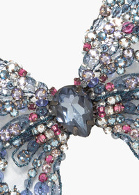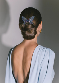 More akin to a piece of fine jewelry than a hair clip, the Absolem Barrette is made by hand in New York, with hand-embroidered Austrian crystals scattered across silk chiffon, dip-dyed to create a vivid ombre effect. Butterflies are iconic emblems of the Jennifer Behr brand, signaling spiritual rebirth and connection to the divine. The butterfly is wired by hand to create the nuanced, lifelike shape, and each one is finished with a French flip clip for secure placement anywhere in the hair— layer multiples at once for a dramatic finished look. Material The Absolem Barrette is made by hand in New York featuring a hand-embroidered Austrian crystal butterfly with French steel flip clip closure. We recommend treating this clip as you would a piece of jewelry, and storing in the dust bag when not in use. Avoid contact with water, perfume, and other chemicals, including hairspray, which should be used before placement in the hair.