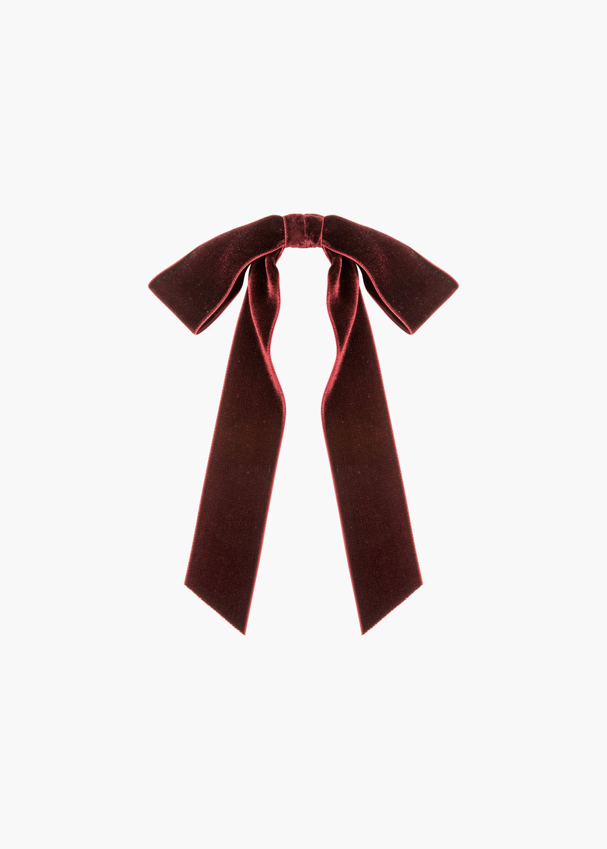 The Adley Velvet Bow Barrette is a sweet addition to our collection of Bows. The thick velvet ribbon's oversized loops are artfully draped, giving the illusion of a ribbon effortlessly tied in the hair, with the simplicity of a barrette closure. Made by hand in New York, this bow features an automatic French barrette closure, making it easy to wear in an endless number of hairstyles, in any type of hair. Dimensions: 9 inch width, 11 inch length Material The Adley Bow Barrette is made by hand in New York of velvet ribbon with a steel French barrette closure. We recommend treating this bow as you would a piece of jewelry, and storing in the dust bag when not in use. Avoid contact with water, perfume, and other chemicals, including hairspray, which should be used before placement in the hair.
