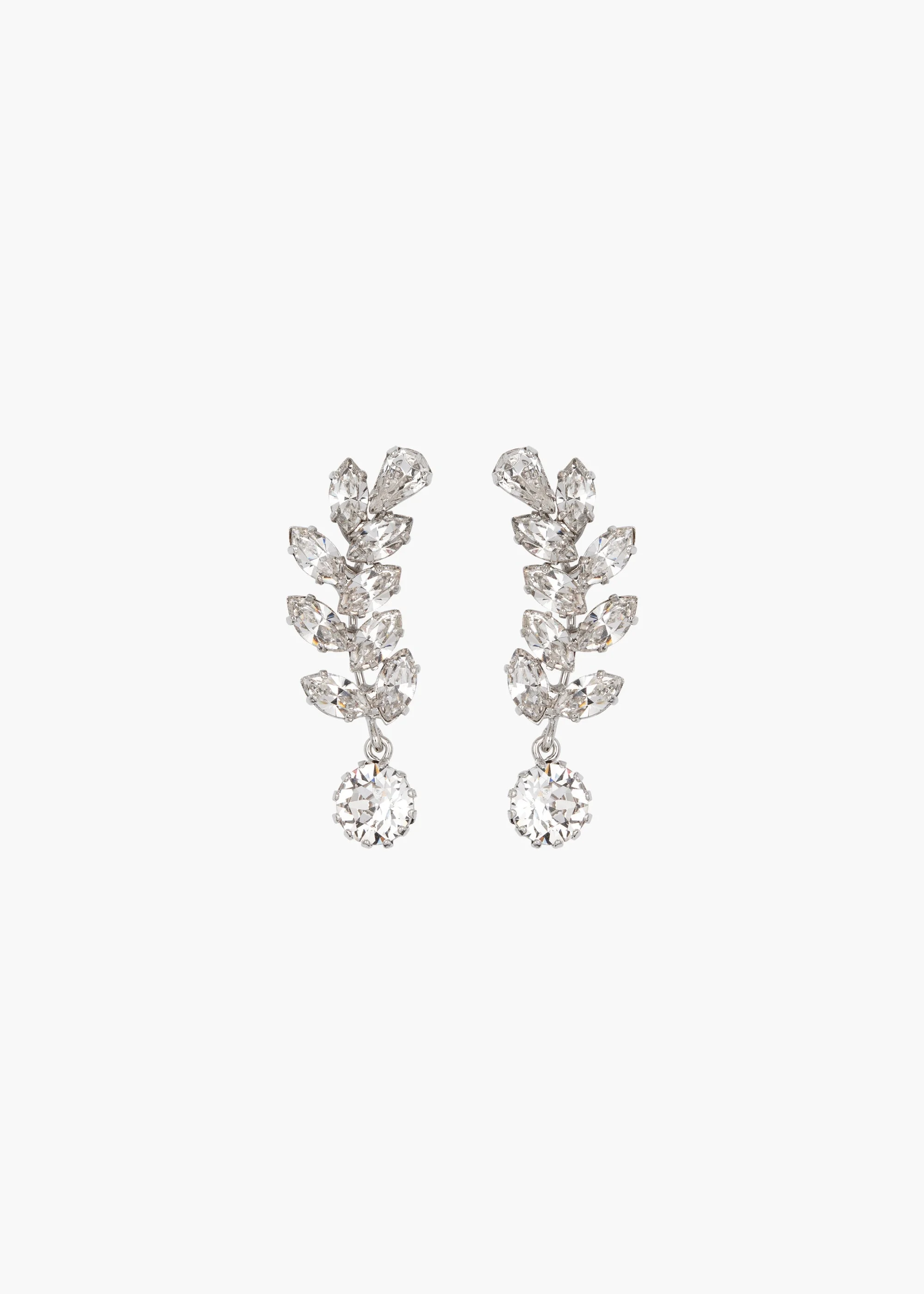 The Alessa Earrings are elegance embodied. Made by hand in New York, the vine of fine crystals forms a subtle serpentine shape, framing the face with brilliant shine. For the same motif with pearl elements, try our Verla Earrings. Dimensions: 1.5" in length. Material The Alessa Earrings are made by hand in New York from 18K gold or rhodium plated brass and crystal. They have a surgical-steel post, are nickel-free, and safe for sensitive skin. We recommend storing earrings in their dust bag while not in use, and avoiding contact with water, perfume, hairspray, and other chemicals.