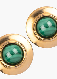 A fresh take on the classic vintage button earring, the Alva Earrings are a marriage of 1980s costume jewelry and fine jewelry techniques— and materials. These oversized studs feature onyx, malachite, or crystal pearl cabochon stones, in an 18-karat gold-plated halo. Crafted by hand in New York, the halo has a raised bezel towards the center, to draw the eye in and further emphasize the beauty of each stone. Dimensions: 1 1/4in x 1 1/4in Material The Alva Earrings are made by hand in New York from 18K gold plated brass and either crystal / crystal pearl or natural semi-precious stone centers. All stones have natural variances in color and markings that make each one unique. They have a surgical-steel post, are nickel-free, and safe for sensitive skin. We recommend storing earrings in their dust bag while not in use, and avoiding contact with water, perfume, hairspray, and other chemicals.