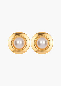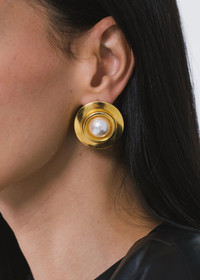 A fresh take on the classic vintage button earring, the Alva Earrings are a marriage of 1980s costume jewelry and fine jewelry techniques— and materials. These oversized studs feature onyx, malachite, or crystal pearl cabochon stones, in an 18-karat gold-plated halo. Crafted by hand in New York, the halo has a raised bezel towards the center, to draw the eye in and further emphasize the beauty of each stone. Dimensions: 1 1/4in x 1 1/4in Material The Alva Earrings are made by hand in New York from 18K gold plated brass and either crystal / crystal pearl or natural semi-precious stone centers. All stones have natural variances in color and markings that make each one unique. They have a surgical-steel post, are nickel-free, and safe for sensitive skin. We recommend storing earrings in their dust bag while not in use, and avoiding contact with water, perfume, hairspray, and other chemicals.
