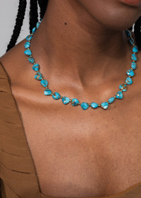 An unexpected twist on a classic gemstone necklace, the Angara Necklace is hand-beaded with heart-shaped turquoise stones. The gemstones are separated by 18-karat gold-plated beads, which emphasize the flecks of gold in the turquoise. Finished with a T-bar clasp, it is designed to be mixed and layered with other pieces in our Semi-Precious Collection. Dimensions: 18" length. Material The Angara Necklace is handmade in New York of semi-precious stones. Our jewelry is nickel-free and safe for sensitive skin. We recommend storing jewelry in its dust bag while not in use, and avoiding contact with water, perfume, hairspray, and other chemicals.