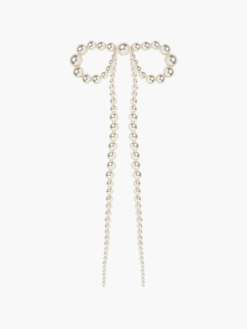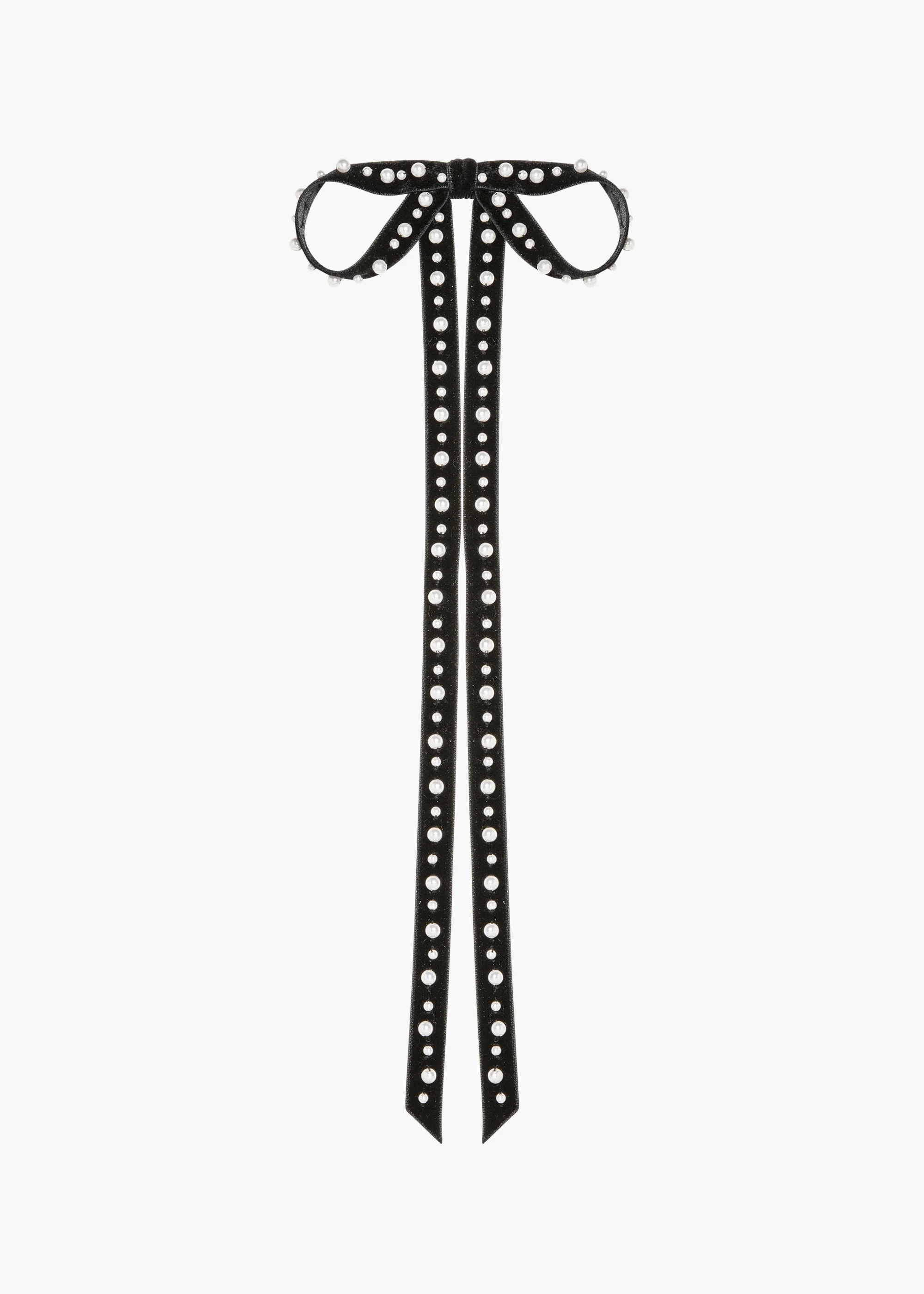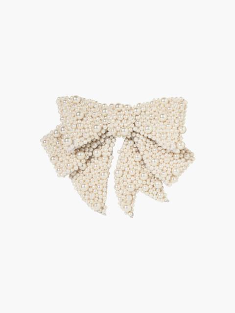 The Annalee Bow Barrette has a distinctly whimsical appeal, featuring embroidered pearls in a playfully exaggerated bow. Crafted from silk velvet, the bow's extra-long tails ripple through the hair like streamers. The bow is finished with an automatic French barrette closure, for easy placement in any style. Dimensions: 5.5 inch width, 14 inch length Material The Annalee Bow Barrette is made by hand in New York of velvet ribbon with embroidered acrylic pearl embellishments and a steel French barrette closure. We recommend treating this bow as you would a piece of jewelry, and storing it in the dust bag when not in use. Avoid contact with water, perfume, and other chemicals, including hairspray, which should be used before placement in the hair.