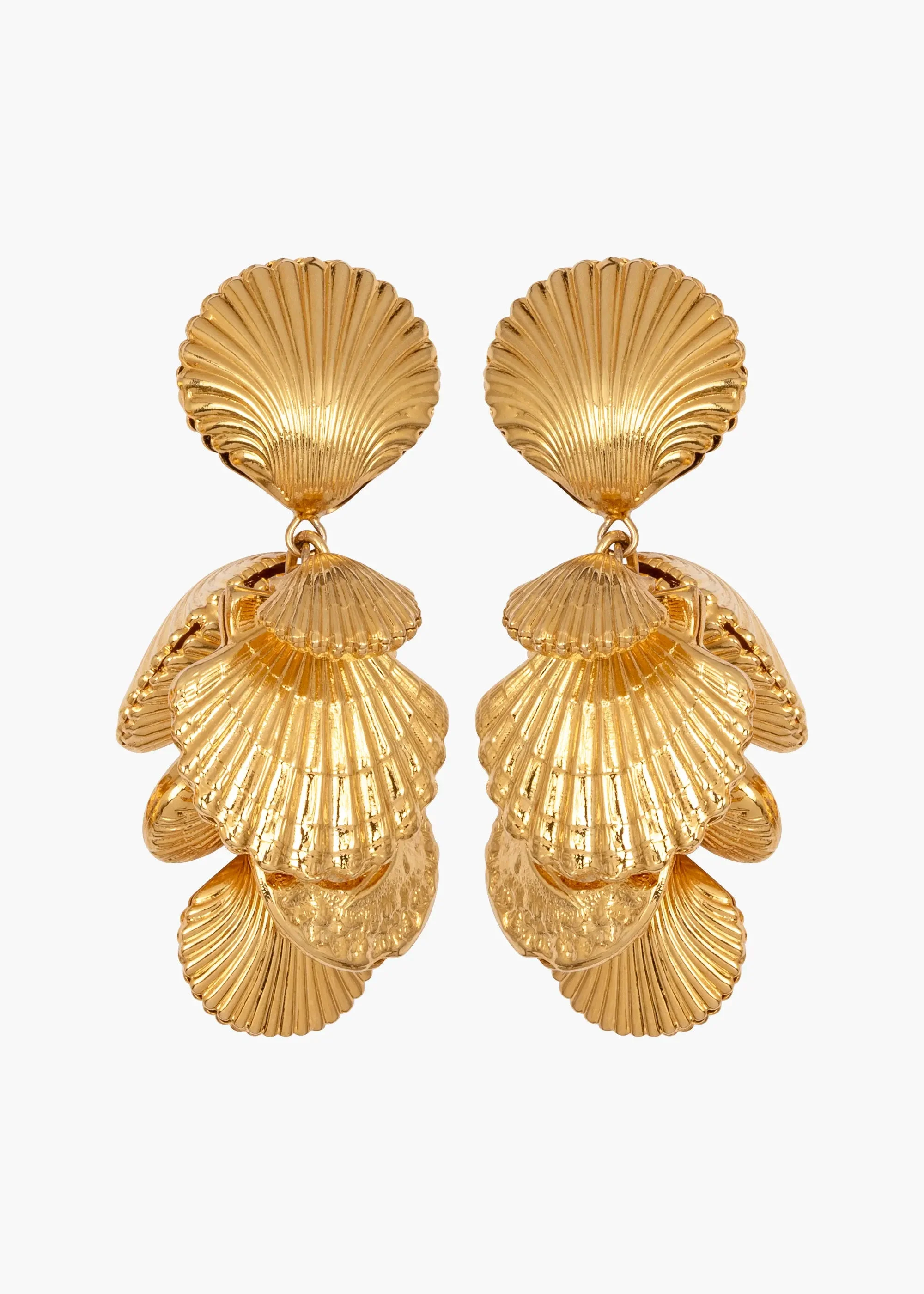 Referencing 1970s jewelry, the Aphrodite Earrings are inspired by the idea of shells collected on far-flung travels. Each charm is gathered and individually attached by hand, in a time-intensive process that creates unrivaled movement. Made by hand in New York, they are plated with 18-karat gold for exceptional luster. Dimensions: 2 3/8 inch length Material The Aphrodite Earrings are made by hand in New York from 18K gold plated brass. They have a surgical-steel post, are nickel-free and safe for sensitive skin. We recommend storing earrings in their dust bag while not in use, and avoiding contact with water, perfume, hairspray, and other chemicals.