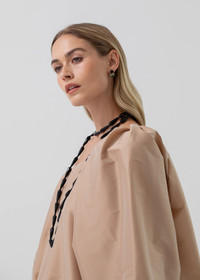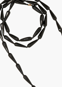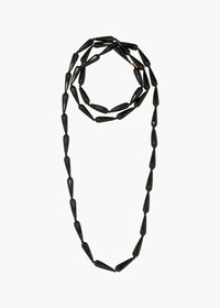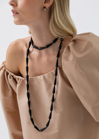 The Asha Necklace is inspired by Venetian elegance and vintage Murano glass chandeliers. Made in New York, it's crafted entirely of hand-cut semi-precious onyx, in a flapper-inspired length. With no clasp, it wraps around the head, giving flexibility to be doubled and worn a number of ways. Material The Asha Necklace is handmade in New York of semiprecious onyx gemstones with 18K gold plated finishings. All stones have natural variances in color and markings that make each one unique. We recommend storing necklaces in their dust bag while not in use, and avoiding contact with water, perfume, hairspray, and other chemicals.