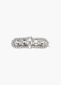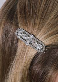 The Athena Barrette is an evolution of one of Jennifer Behr's earliest pieces, a testament to the staying power of great design. The Art Deco arrangement of fine Austrian crystals centers upon exquisite emerald-cut stones. It's finished with a pinch-clasp barrette typically found in fine jewelry. Dimensions: 2.25" x 0.75" Material The Athena Barrette is handmade in New York of Austrian crystals with a steel French barrette closure plated in rhodium or 18k gold. We recommend treating the barrette as you would a piece of jewelry, and storing it in the dust bag when not in use. Avoid contact with water, perfume, and other chemicals, including hairspray, which should be used before placement in the hair