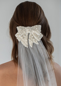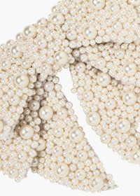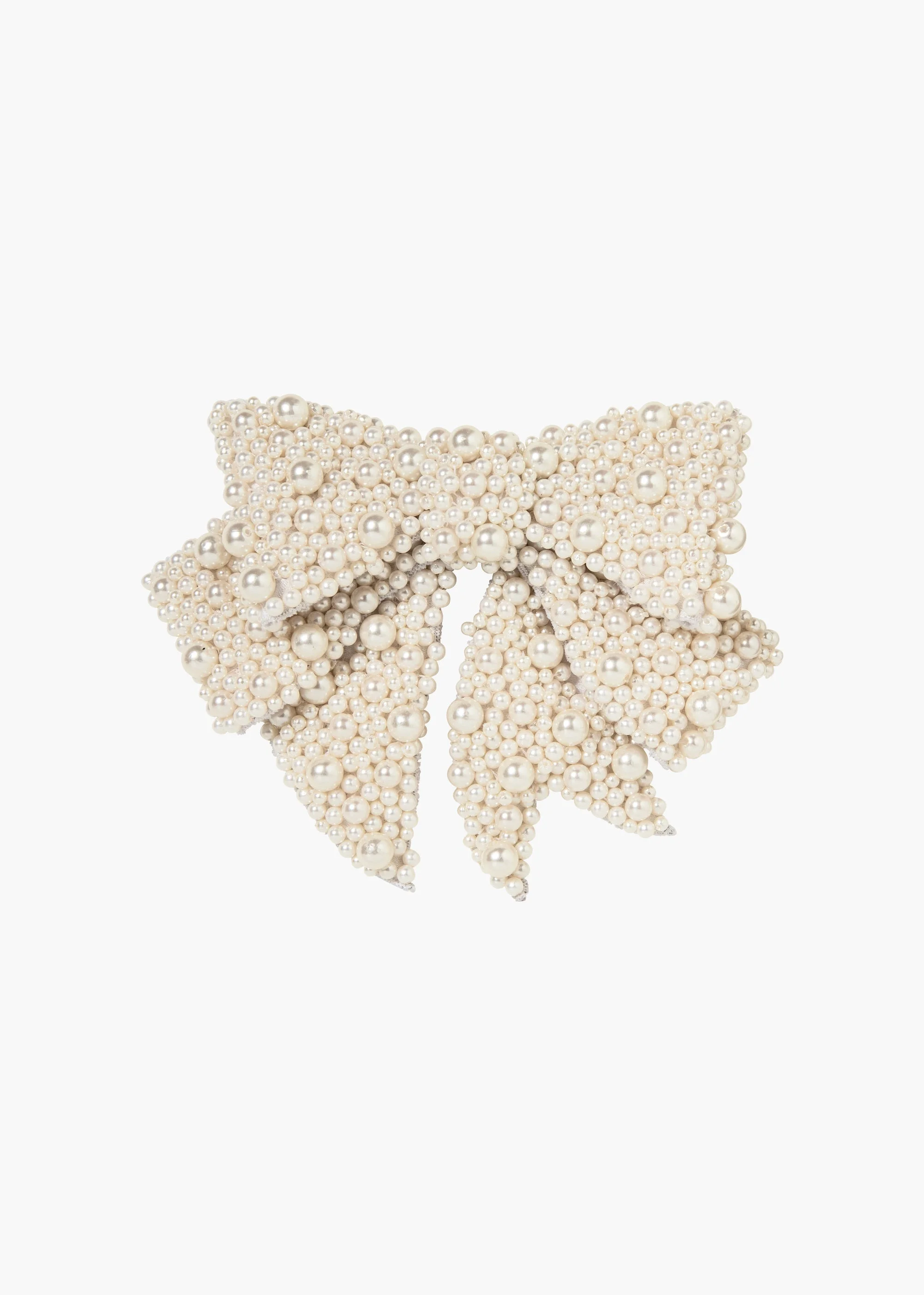 An accessory with remarkable presence, the Bianca Bow Barrette is blanketed in countless pearl stones, hand-embellished using different sizes for a graphic, three-dimensional look. Its stylized silhouette gives the illusion of a fluid ribbon unfurling splendidly. It fastens with an automatic French barrette closure, for secure placement regardless of its position in the hair. Dimensions: 5.5 inch width, 4.5 inch length Material The Bianca Bow Barrette is made by hand in New York of silk with hand embellished crystal pearls and finished with a steel French barrette closure. We recommend treating this bow as you would a piece of jewelry, and storing in the dust bag when not in use. Avoid contact with water, perfume, and other chemicals, including hairspray, which should be used before placement in the hair.