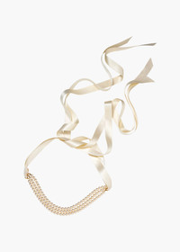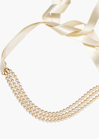 The Blaire Ribbon Tie is our modern twist on a classic pearl choker. Three rows of beaming pearls are suspended from luxurious silk ribbons. The ribbon ties secure it in the back, making the length adjustable to fit perfectly. Material The Blarie Ribbon Tie is made by hand in New York of silk satin ribbon and crystal pearls. We recommend storing this piece in its dust bag when not in use. Avoid contact with water, perfume, and other chemicals, including hairspray, which should be used before placement in the hair or on the body.