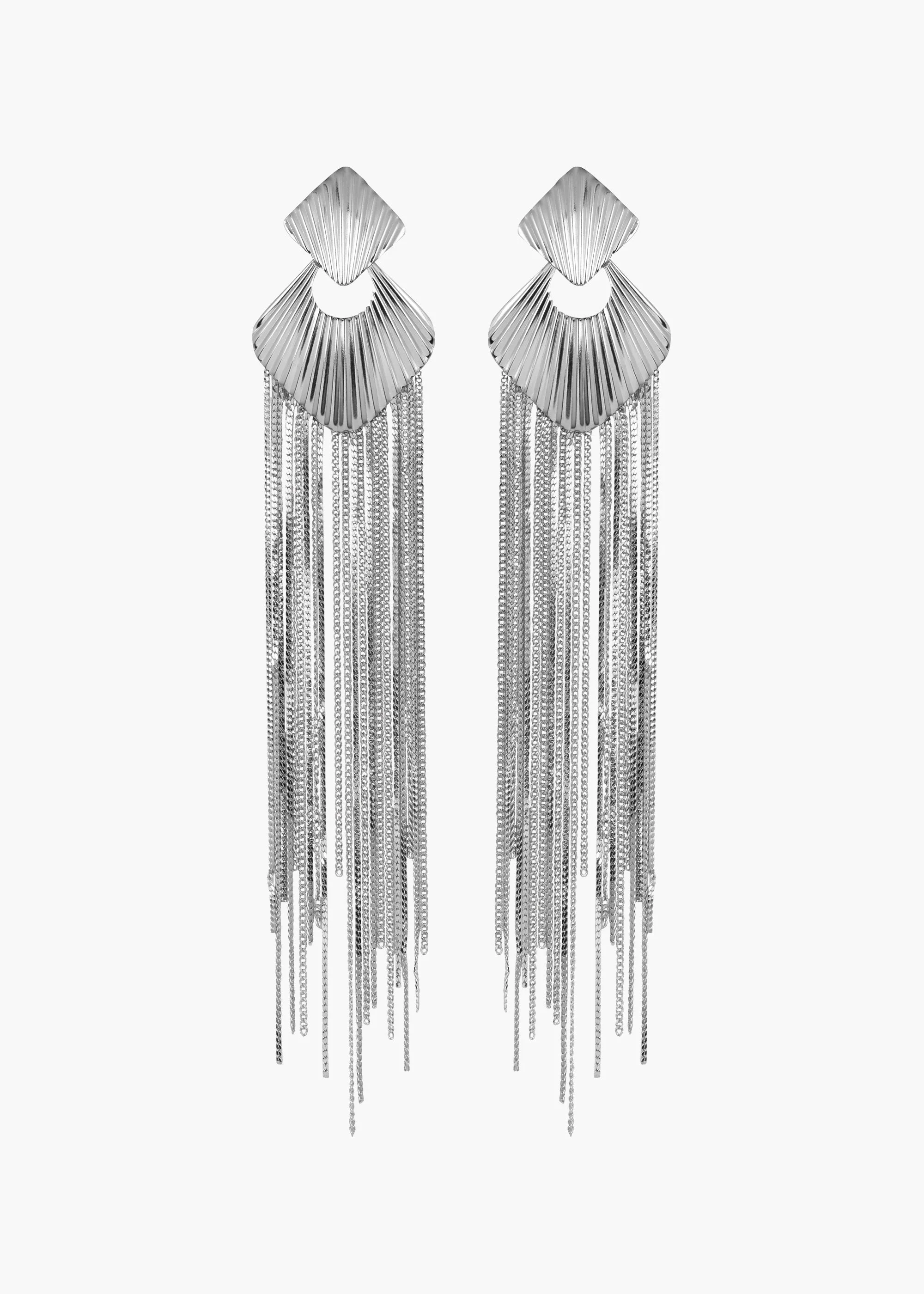 The Blythe Earrings skillfully combine Art Deco-inspired shapes with shoulder-grazing fringe for a scene-stealing statement. Made by hand in New York, the 18-karat gold or rhodium-plated brass is fluted, with fine chain fringe that adds drama and movement, without weight. The fringe appears to be a continuation of the ridged rays, creating a visually lengthening effect. Dimensions: 8" length Material The Blythe Earrings are made by hand in New York from 18K gold or rhodium plated brass. They have a surgical-steel post, are nickel-free and safe for sensitive skin. We recommend storing earrings in their dust bag while not in use, and avoiding contact with water, perfume, hairspray, and other chemicals.