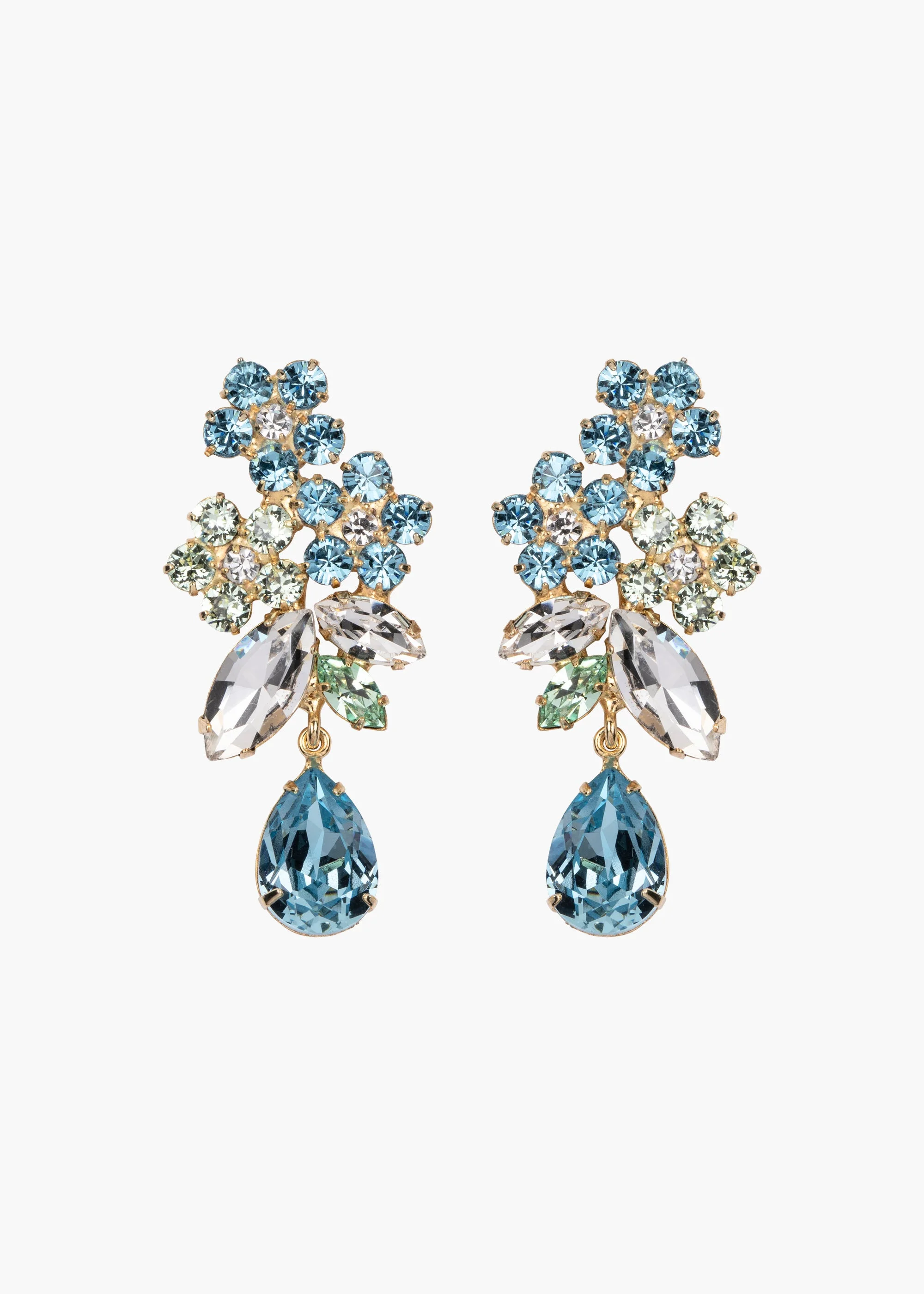 The aptly-named Bouquet Earrings are wearable floral arrangements, offering a welcome dose of irreverent glamour. Each bouquet is assembled of fine crystals in a variety of cuts and shapes, creating a spectacular feast for the eyes. Interesting yet compact, they are perfectly sized to incorporate into any look. Dimensions: 1.5" length Material The Bouquet Earrings are made by hand in New York from 18K gold plated brass and crystals. They have a surgical-steel post, are nickel-free, and safe for sensitive skin. We recommend storing earrings in their dust bag while not in use, and avoiding contact with water, perfume, hairspray, and other chemicals.
