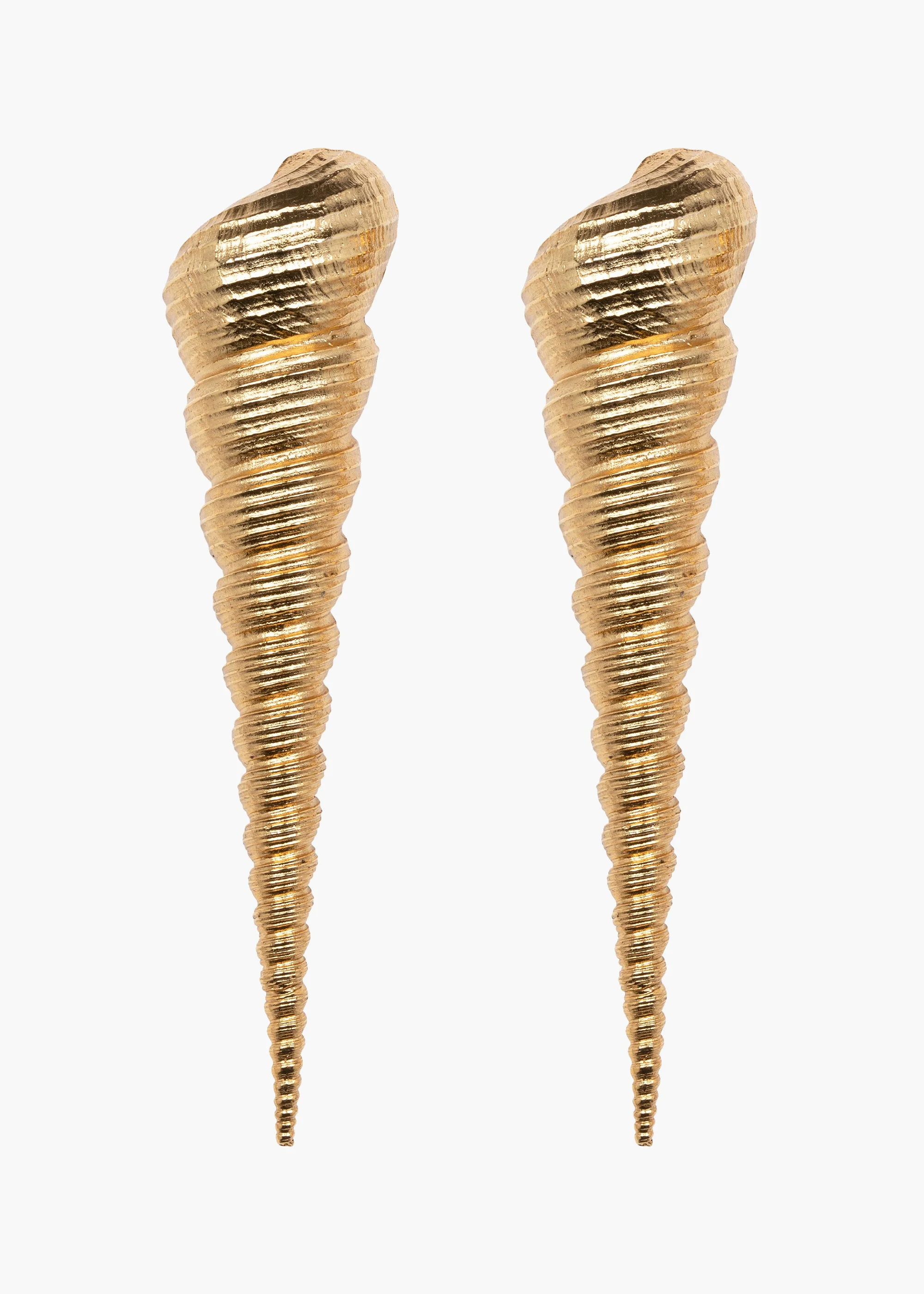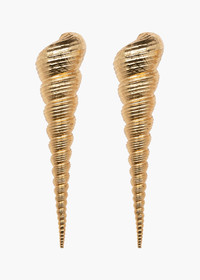 An absolutely memorable statement, the Bronte Earrings are a dramatic finishing touch that instantly conjures images of exotic destinations. Each one is made by hand in New York, forming auger shells— complete with the shoulder-grazing, true-to-life scale of actual seashells. Despite their attention-grabbing silhouette, their 18-karat gold-plated finish means they are surprisingly easy to wear. Dimensions: 4.5 inch length Material The Bronte Earrings are made by hand in New York from 18K gold plated brass. They have a surgical-steel post, are nickel-free, and safe for sensitive skin. We recommend storing earrings in their dust bag while not in use, and avoiding contact with water, perfume, hairspray, and other chemicals.