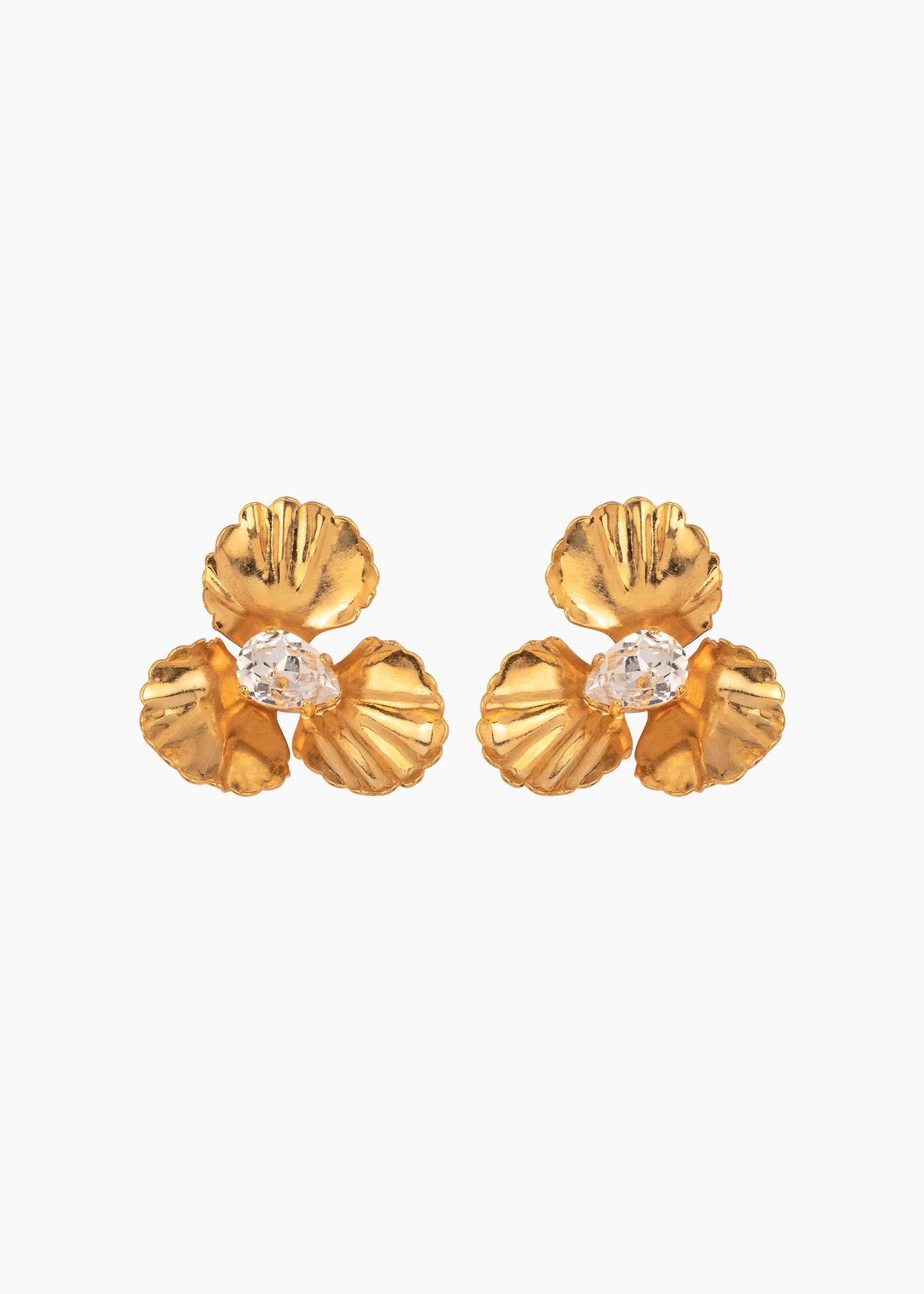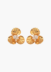 The dressed-up sister of our best-selling Pansy Earrings, the Caelyn Earrings are finished with an unexpected pear-cut Austrian crystal. Made by hand in New York and plated with 18-karat gold, each petal is hand-sculpted to achieve its lifelike texture. Pair these earrings with a golden hair accessory, like the matching Panola Barrette or Pansy Bobby Pin. Dimenions: 1in x 1in Material The Caelyn Earrings are made by hand in New York from 18K gold plated brass and Austrian crystals. They have a surgical-steel post, are nickel-free, and safe for sensitive skin. We recommend storing earrings in their dust bag while not in use, and avoiding contact with water, perfume, hairspray, and other chemicals.