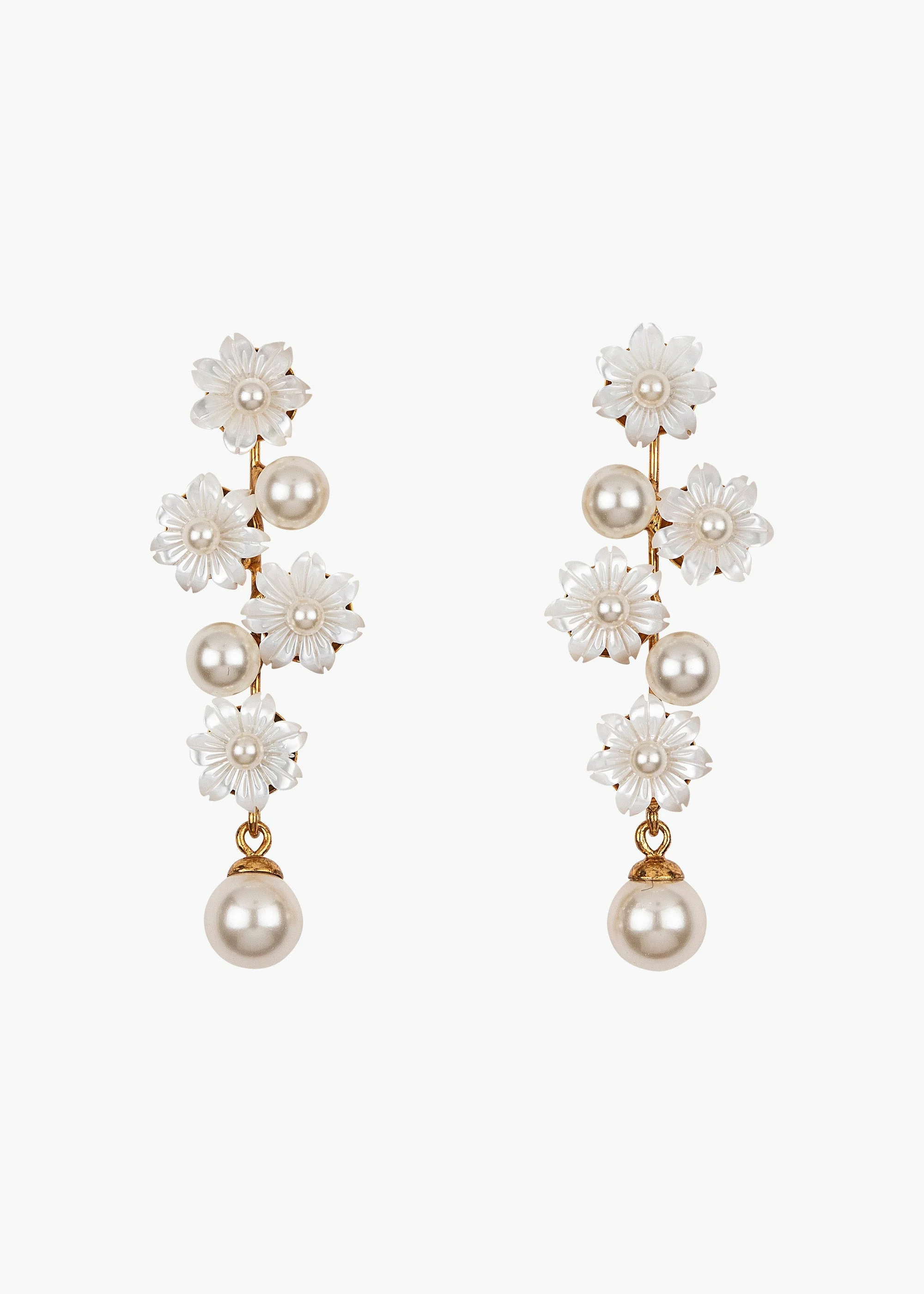 The Calissa Earring is a dainty, dangling style, comprised of small hand-carved mother of pearl flowers and crystal pearls. We love mother of pearl for its natural iridescence, and the magical way it catches the light. Combined with the graceful movement of these drops, it creates a flattering glow you won't want to be without. Material The Calissa Earring is a post earring with a surgical-steel post. Our earrings are nickel-free and safe for sensitive skin. These earrings are crafted by hand in New York from mother of pearl and pearl. We recommend storing earrings in their dust bag while not in use, and avoiding contact with water, perfume, hairspray, and other chemicals.