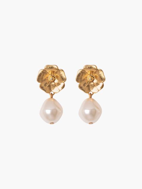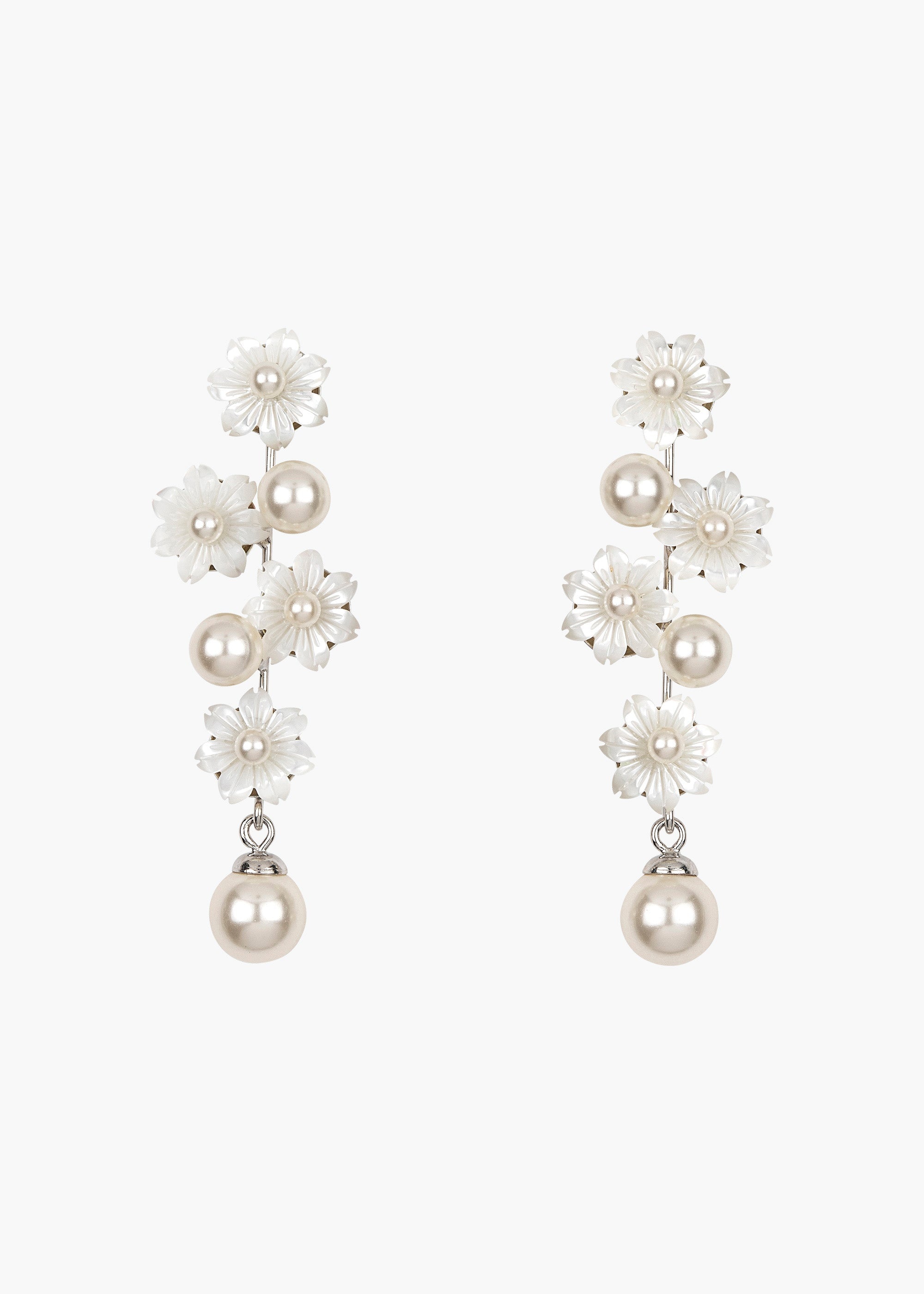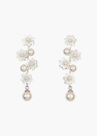 The Calissa Earring is a dainty, dangling style, comprised of small hand-carved mother of pearl flowers and crystal pearls. We love mother of pearl for its natural iridescence, and the magical way it catches the light. Combined with the graceful movement of these drops, it creates a flattering glow you won't want to be without. Material The Calissa Earring is a post earring with a surgical-steel post. Our earrings are nickel-free and safe for sensitive skin. These earrings are crafted by hand in New York from mother of pearl and pearl. We recommend storing earrings in their dust bag while not in use, and avoiding contact with water, perfume, hairspray, and other chemicals.