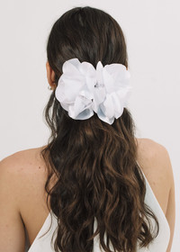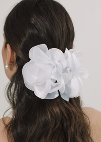 Dramatic yet endlessly wearable, the Carly Jaw Clip instantly elevates a look. Made by hand in New York, the satin is draped by hand to form the voluminous flower. It sits on a sturdy acetate jaw clip for secure placement a range of hairstyles. Dimensions: 6" width, 6" length. Material The Carly Jaw Clip is made by hand in New York of satin flowers with an acrylic resin claw clip. We recommend treating this clip as you would a piece of jewelry, and storing in the dust bag when not in use. Avoid contact with water, perfume, and other chemicals, including hairspray, which should be used before placement in the hair.