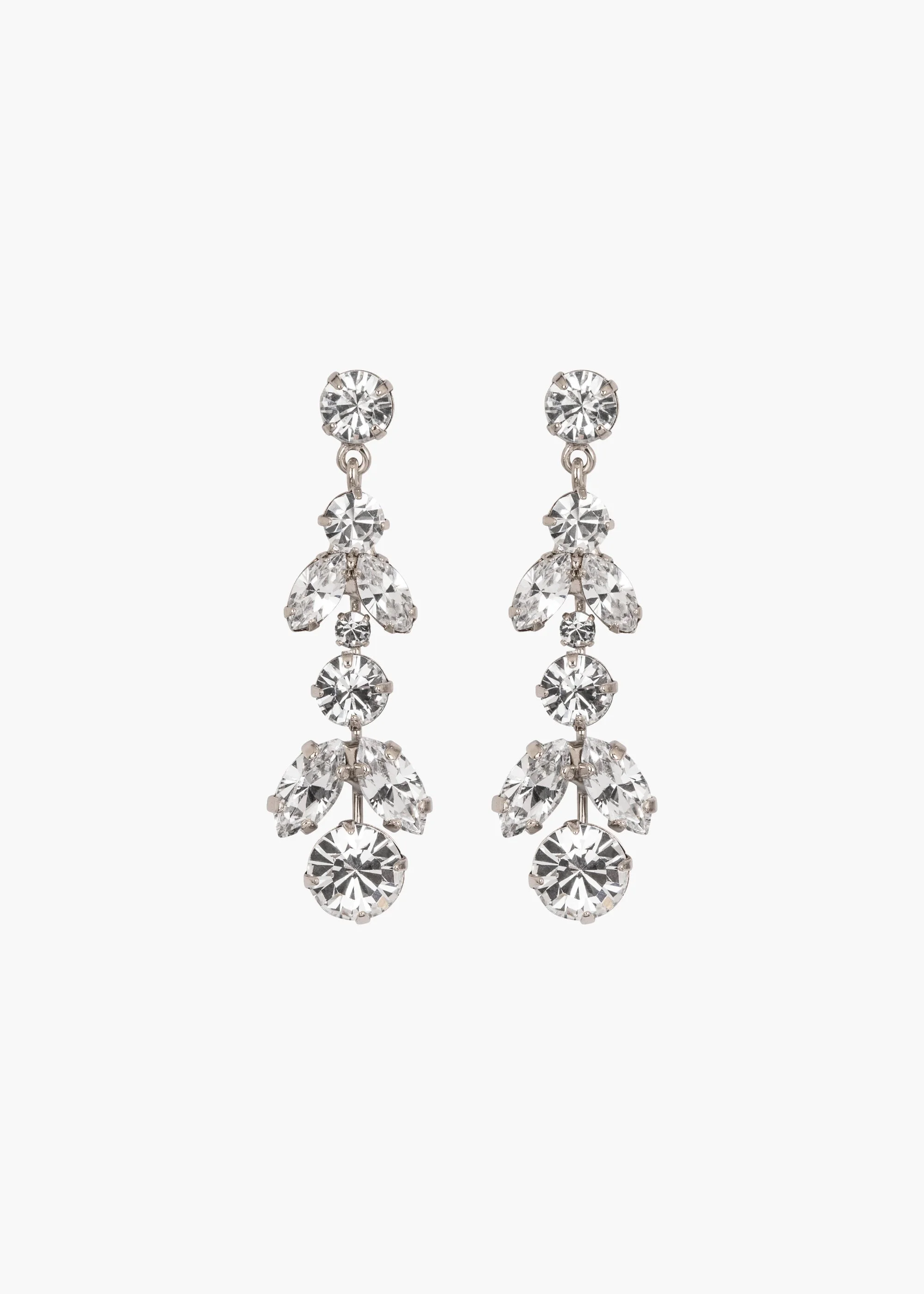 With an antique-inspired design, the Carolena Earrings highlight the richness, depth, and sparkle of the fine Austrian crystals that comprise them. Made by hand in New York, the round and marquise-cut stones are arranged in a delicate rhodium-plated setting. These earrings are intentionally designed to be versatile finishing touches, elegantly completing a wide range of looks. Material The Carolena Earrings are made by hand in New York from 18K gold or rhodium plated brass and Austrian crystals. They have a surgical-steel post, are nickel-free, and safe for sensitive skin. We recommend storing earrings in their dust bag while not in use, and avoiding contact with water, perfume, hairspray, and other chemicals.