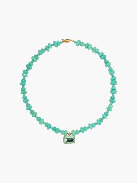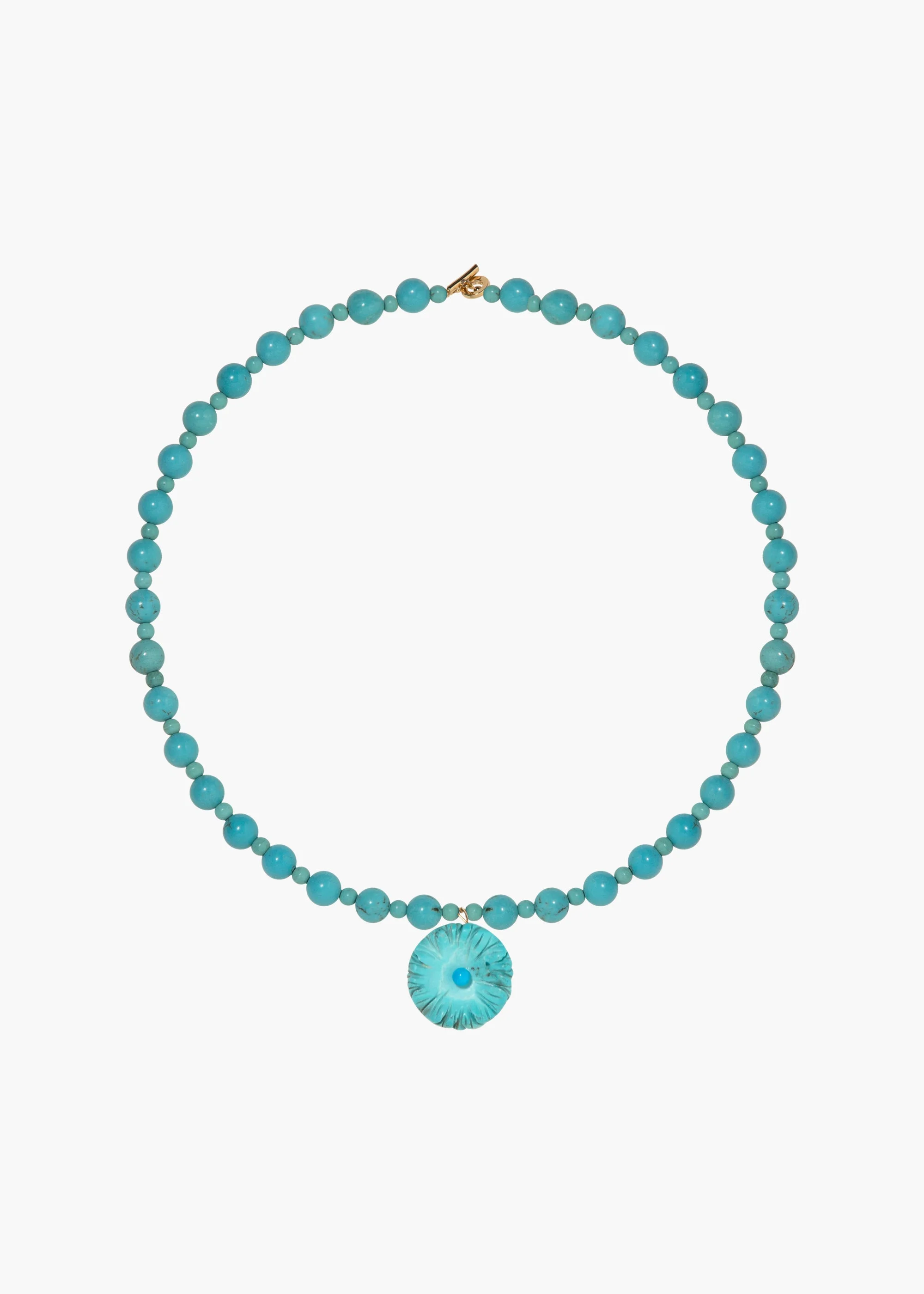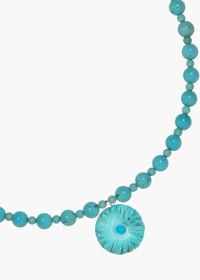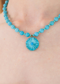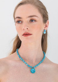 Hand-beaded with semi-precious turquoise stones in alternating sizes, the Chanda Necklace is a breath of fresh air. The flower drop is carved by hand, highlighting the innate variations in the natural stones that make each one unique. Finished with an 18-karat gold-plated T-bar clasp, this necklace is designed to be mixed and layered with other pieces in our Semi-Precious Collection. Dimensions: 18" length. Material The Chandra Necklace is handmade in New York of semi-precious stones. Our jewelry is nickel-free and safe for sensitive skin. We recommend storing jewelry in its dust bag while not in use, and avoiding contact with water, perfume, hairspray, and other chemicals.