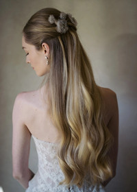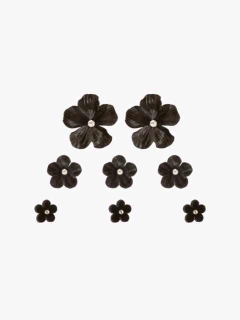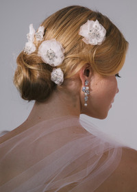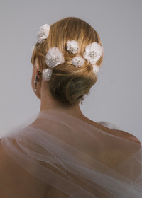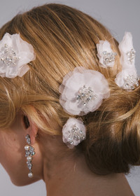The Chantrell Bobby Pin Set is a set of seven pins, featuring individually hand-cut silk chiffon and organza petals. The juxtaposition of the frothy silk and the striking crystal stamen make these so dimensional, special, and easy to pair with a variety of special-occasion ensembles. This set is beautiful paired with our Kira Hair Magnet Set or the matching Chantrell Barrette. Dimensions: Largest pin: 1 1/8 in height, 1 1/8 in width, 2 in length. Smallest pin: 5/8 in height, 5/8 in width, 2 in length. Material The Chantrell Bobby Pins are a set of 7, assembled by hand in New York of fine Indian hand embroidered silk flowers with Czech crystal stamen centers on rhodium plated durable steel bobby pin, designed to stay firmly in place, once other pins have the hairstyle securely fastened. We recommend treating each pin as you would a piece of jewelry, and storing in the dust bag when not in use. Avoid contact with water, perfume, and other chemicals, including hairspray, which should be used before placement in the hair.