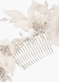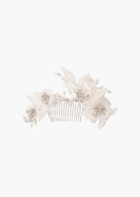 The Chantrell Comb combines hand-cut silk chiffon and organza foliage with Czech crystal stamen and baroque pearl floral sprigs to create a mixed-media masterpiece. Worn atop a veil, this comb flawlessly finishes the look of a veil; wear with the matching Chantrell Bobby Pin Set scattered in for an ethereal look once the veil is removed. This comb can be styled a number of additional ways: wrapped around a chignon, slipped in a French twist, or tucked in the side of the hair for a side-swept look. Dimensions: 4.5” in height, 10.5” length. Material The Chantrell Comb is finished in New York of silk organza hand beaded and embroidered in India, on a steel comb, which is designed to stay firmly in place, once other pins have the hairstyle securely fastened. We recommend treating this comb as you would a piece of jewelry, and storing in the dust bag when not in use. Avoid contact with water, perfume, and other chemicals, including hairspray, which should be used before placement in the hair.