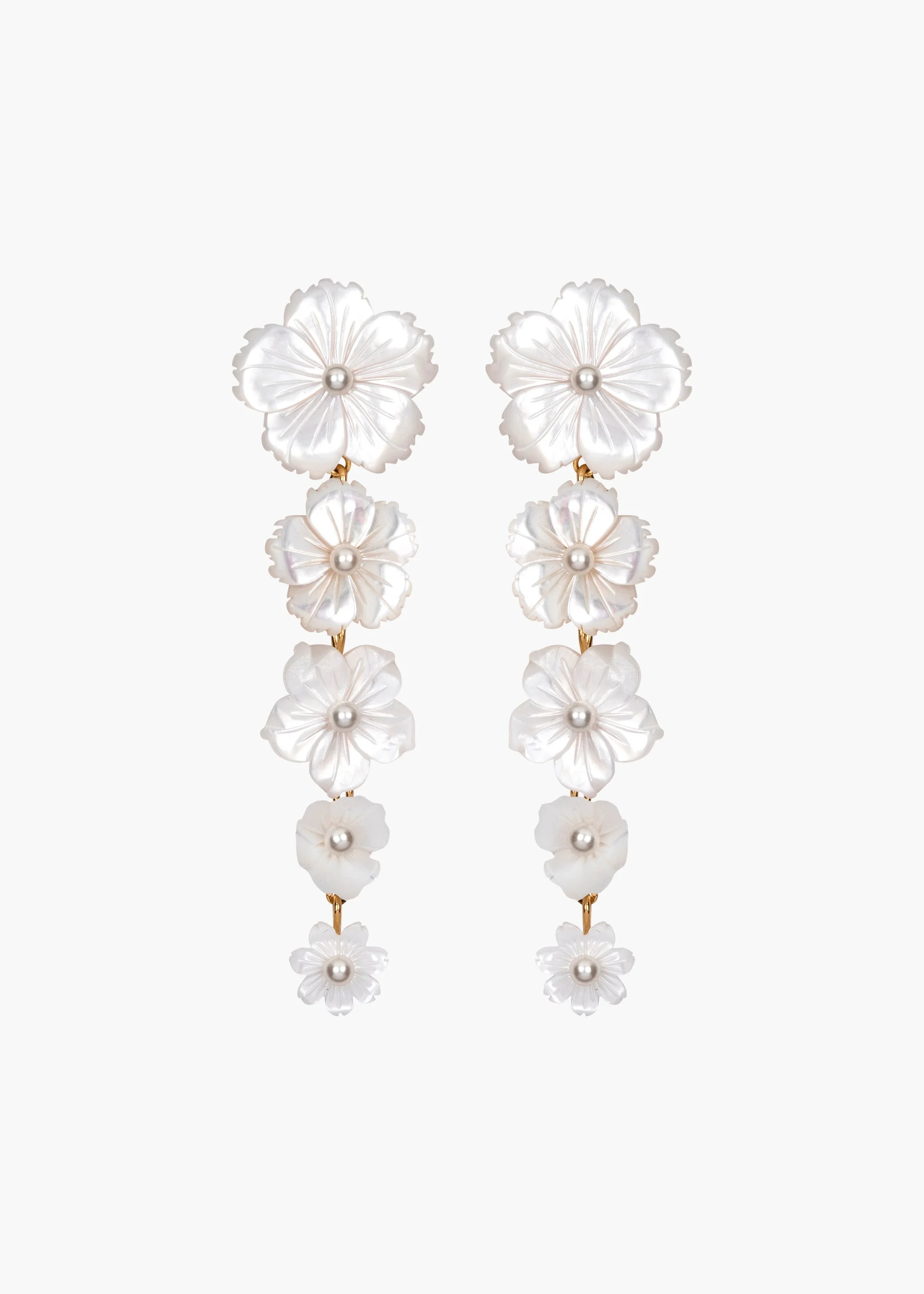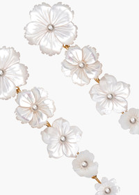 The Chelsey Earrings are a declaration of our love for mother of pearl, a material we adore for its soulful depth and natural luster that cannot be replicated. Each mother of pearl flower is carved by hand with painstaking detail, set in the center with a hand-placed pearl, and individually articulated for fluid movement between each flower. A smaller version of our Hyacinth Earrings, the 18-karat gold-plated custom-made setting is soldered by hand to let the details shine. Dimensions: 2.75" length. Material The Chelsey Earrings are made by hand in New York from 18K gold plated brass and mother of pearl flowers. They have a surgical-steel post, are nickel-free, and safe for sensitive skin. We recommend storing earrings in their dust bag while not in use, and avoiding contact with water, perfume, hairspray, and other chemicals.