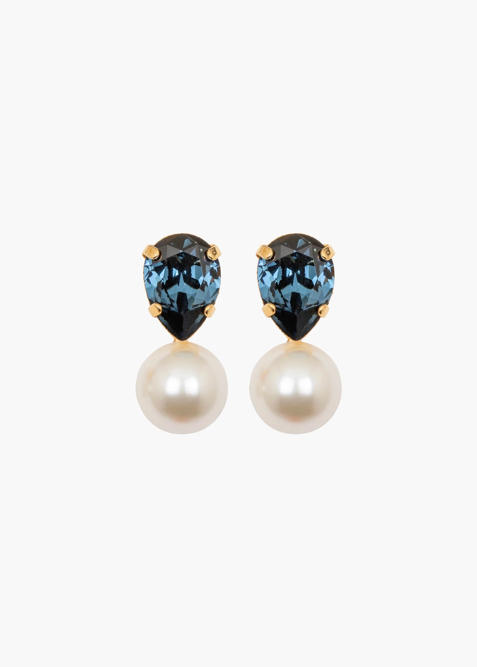 Stunning in their simplicity, the Cimone Earrings are a fresh take on a classic drop earring, fit for any occasion. Made by hand in New York, they feature a pear-cut Austrian crystals, with crystal pearl drops. Their petite size and layered materials allow these earrings to pair perfectly with a wide array of jewelry and hair accessories from our collection. Dimensions: 1 1/4in x 7/8in Material The Cimone Earrings are made by hand in New York from Gunmetal or 18K gold plated brass and Austrian crystal pearls. They have a surgical-steel post, are nickel-free, and safe for sensitive skin. We recommend storing earrings in their dust bag while not in use, and avoiding contact with water, perfume, hairspray, and other chemicals.