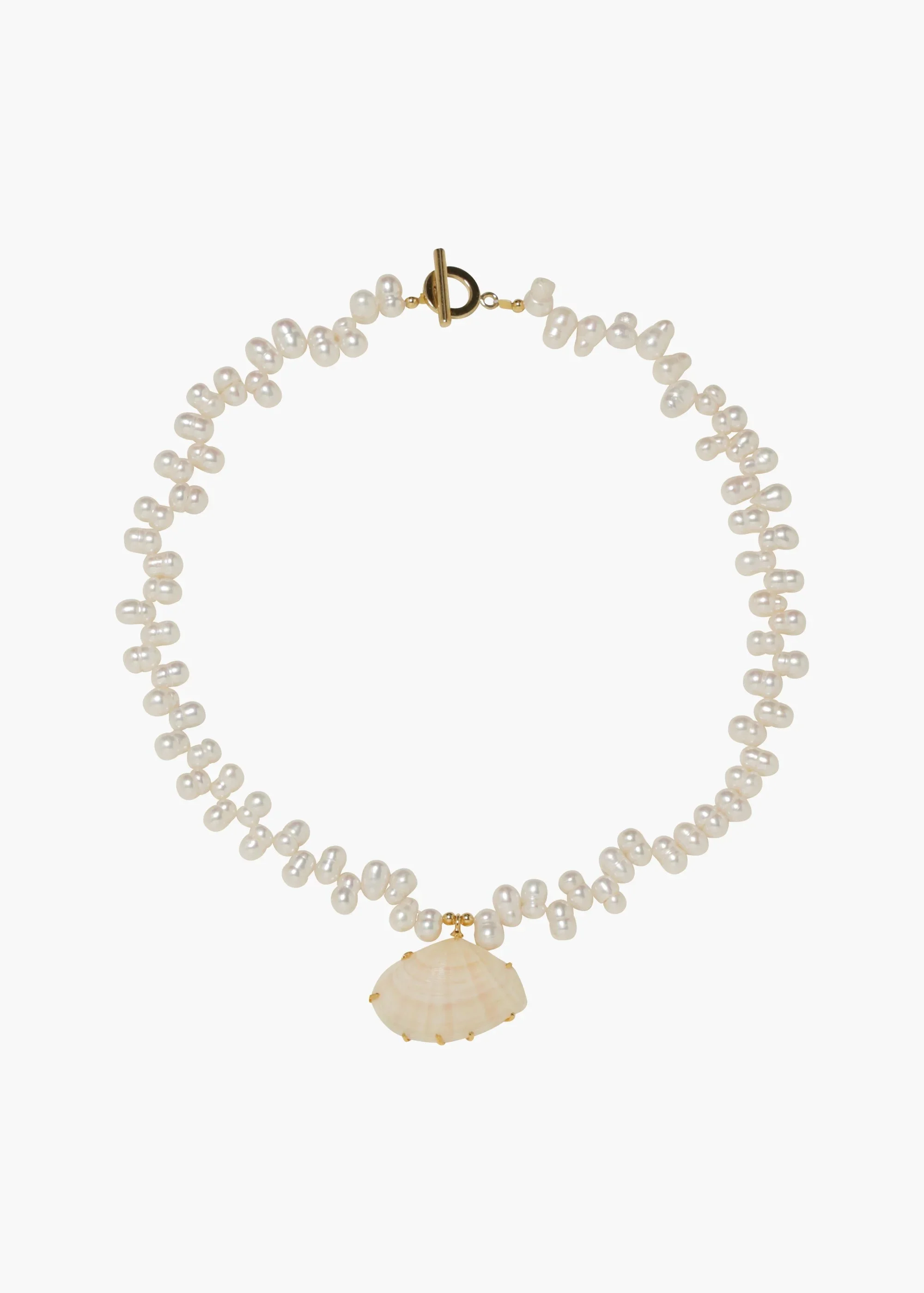 The romantic Coquina Necklace combines nature's sweetest offerings, in soft blush tones. Strung with freshwater rice pearls, staggered to create a scalloped effect, it's finished with a pink clam shell pendant, and complete with a hand-formed setting to respect the shell's organic shape. Made by hand in New York, this necklace pairs perfectly with freshwater pearl earrings from our collection. Dimensions: 18 inch length Material The Coquina Necklace is handmade in New York of freshwater baroque pearls with a natural seashell pendant, and 18K gold plated brass T-bar and loop clasp. All shells have natural variances in color and markings that make each one unique. We recommend storing necklaces in their dust bag while not in use, and avoiding contact with water, perfume, hairspray, and other chemicals.