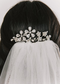 The Danna Comb features oversized florals for a playful take on classic hair comb. Made by hand in New York, the graphic bouquet is formed with fine Czech crystals. It can be styled in a chignon, slipped into a French twist, tucked in the side of the hair, or worn to finish the look of a veil. Dimensions: 3” in height, 7 in length. Material The Danna Comb is made by hand in New York of swarovski crystals, on a steel comb, which is designed to stay firmly in place, once other pins have the hairstyle securely fastened. We recommend treating this comb as you would a piece of jewelry, and storing in the dust bag when not in use. Avoid contact with water, perfume, and other chemicals, including hairspray, which should be used before placement in the hair.