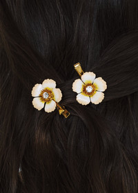 The Debbie Clips are a set of two, with exquisite color gradation that brings the flowers to life. To achieve this soft detailing, each flower is painted by hand in our New York studio in a process that takes three days to complete. Each is finished with a crystal center and an alligator clip for secure placement in the hair, and can be layered with multiple sets worn at once, or mixed with the Debreanna Clips. Dimensions: 1 inch height, 1 inch width Material The Debbie Hair Clips are a set of two and made by hand in New York of hand-painted 18K gold plated brass and Czech crystals with French steel clip closures. We recommend treating these clips as you would a piece of jewelry, and storing in the dust bag when not in use. Avoid contact with water, perfume, and other chemicals, including hairspray, which should be used before placement in the hair.