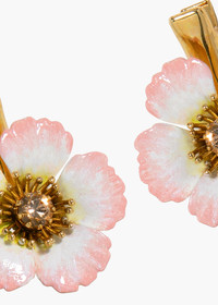 The Debbie Clips are a set of two, with exquisite color gradation that brings the flowers to life. To achieve this soft detailing, each flower is painted by hand in our New York studio in a process that takes three days to complete. Each is finished with a crystal center and an alligator clip for secure placement in the hair, and can be layered with multiple sets worn at once, or mixed with the Debreanna Clips. Dimensions: 1 inch height, 1 inch width Material The Debbie Hair Clips are a set of two and made by hand in New York of hand-painted 18K gold plated brass and Czech crystals with French steel clip closures. We recommend treating these clips as you would a piece of jewelry, and storing in the dust bag when not in use. Avoid contact with water, perfume, and other chemicals, including hairspray, which should be used before placement in the hair.