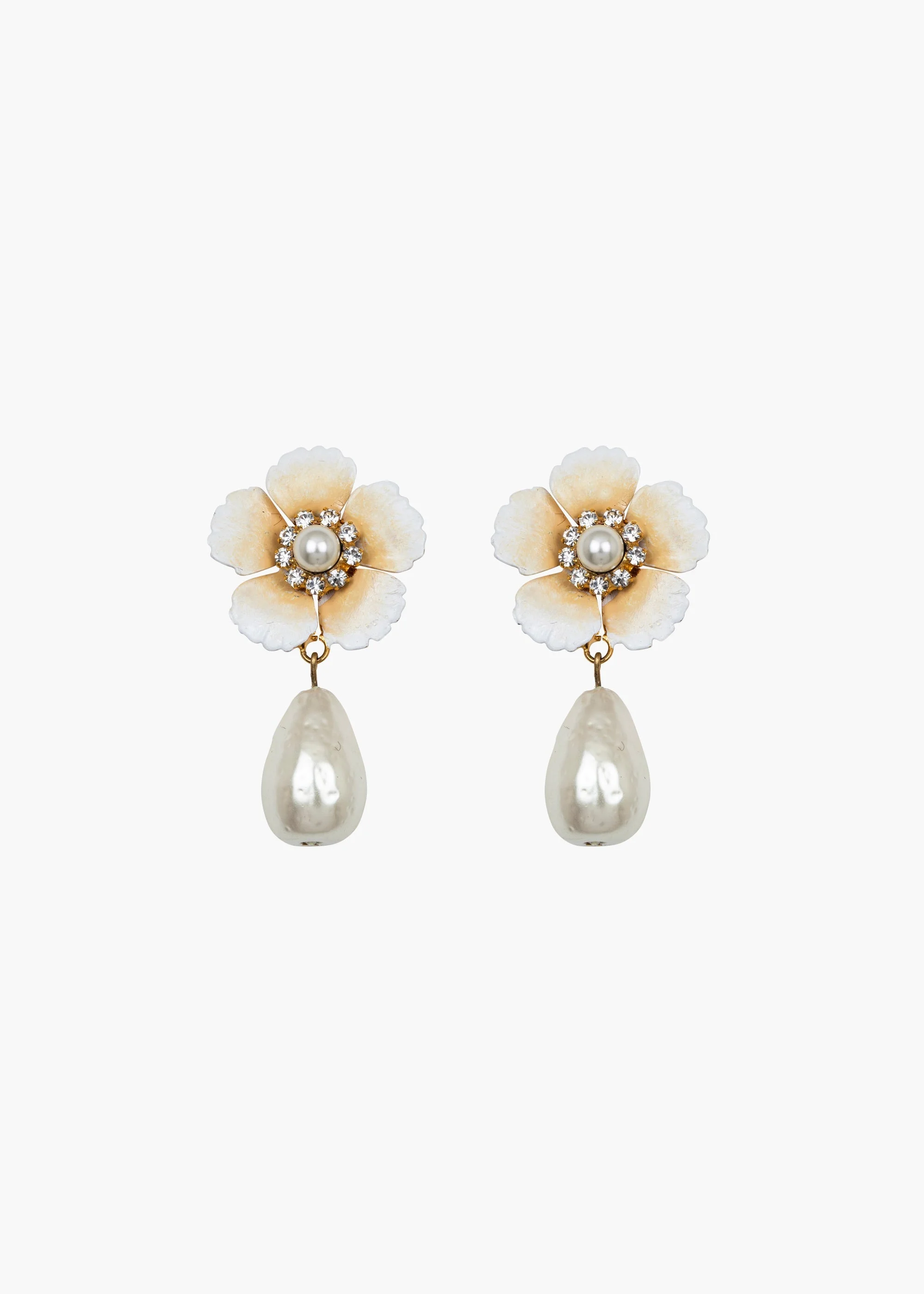 The Deborah Earrings' enticing florals convey the sort of dark romance we always welcome. Made in New York, each flower is individually painted by hand for a one-of-a-kind finish. The look is complete with a baroque-style pearl detail for added movement. Dimensions: 2 inch length Material The Deborah Earrings are made by hand in New York from 18K gold plated brass and crystal pearls and finished with hand-painted details. They have a surgical-steel post, are nickel-free, and safe for sensitive skin. We recommend storing earrings in their dust bag while not in use, and avoiding contact with water, perfume, hairspray, and other chemicals.