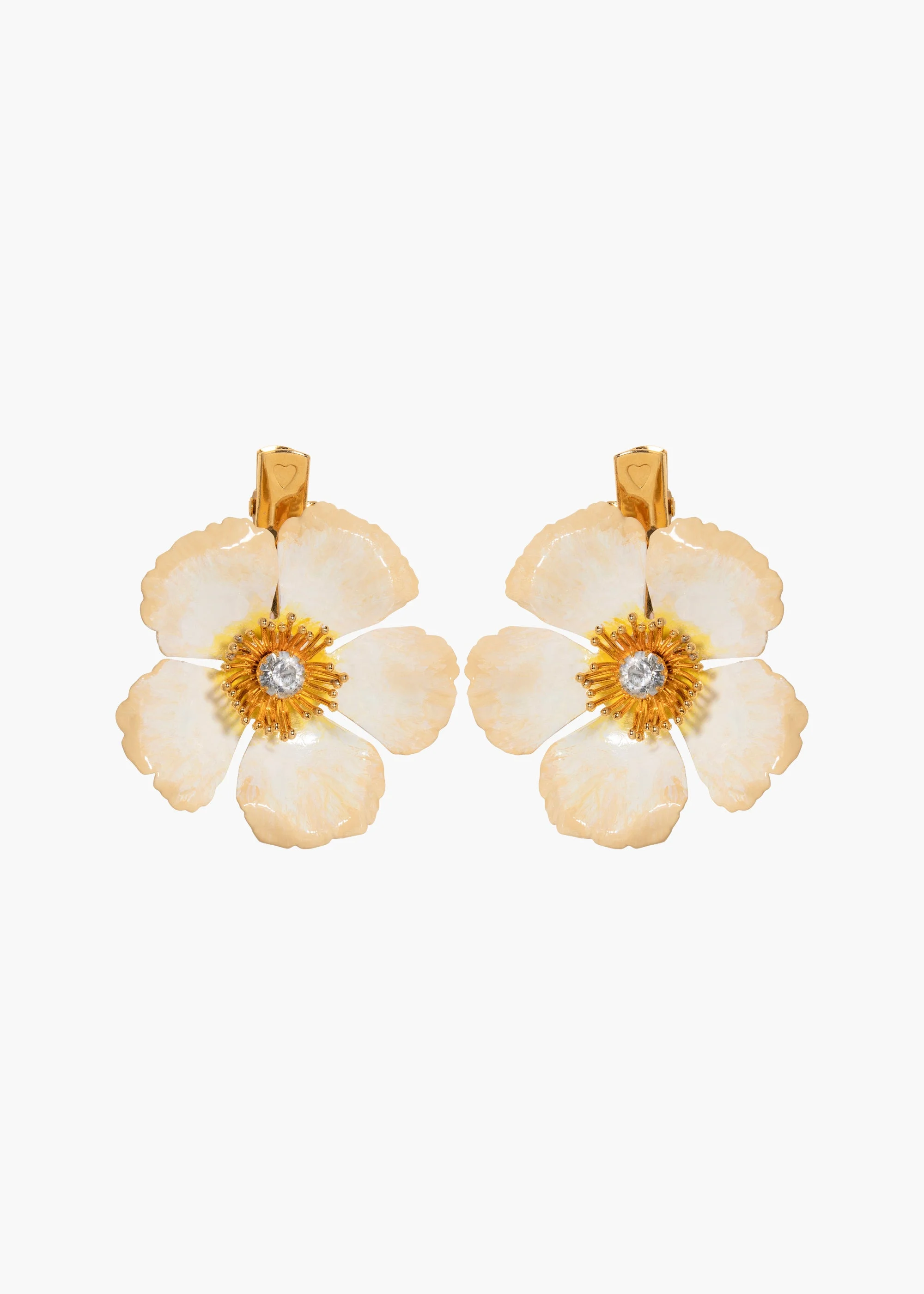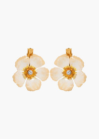 A larger version of our Debbie Clips, the Debreanna Clips are a set of two striking blooms, with exquisite color gradation that brings the flowers to life. To achieve this soft detailing, each flower is painted by hand in our New York studio in a process that takes three days to complete. Each is finished with a crystal center and an alligator clip for secure placement in the hair, and can be layered with multiple sets worn at once, or mixed with the Debbie Clips. Dimensions: 1.75 inch height, 1.75 inch width Material The Debreanna Hair Clips are a set of two and made by hand in New York of hand-painted 18K gold plated brass and Czech crystals with French steel clip closures. We recommend treating these clips as you would a piece of jewelry, and storing in the dust bag when not in use. Avoid contact with water, perfume, and other chemicals, including hairspray, which should be used before placement in the hair.